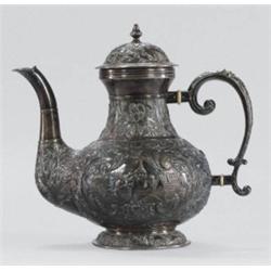 holland, 19. sz. második fele, ezüst, "BSI" mesterjegy, trébelt zsánerjelenettel és növényi ornamentikával díszítve, elefántcsont gyurukkel, leveheto fedéllel, 495,4 g; m: 10 cm