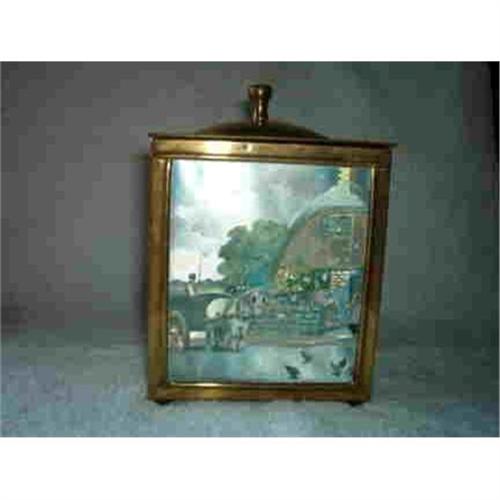 4.1/4" square and 4.1/2" tall this tea caddy has three beaten brass sides and one bucolic country scene on the other. Tinned interior Circa 1900