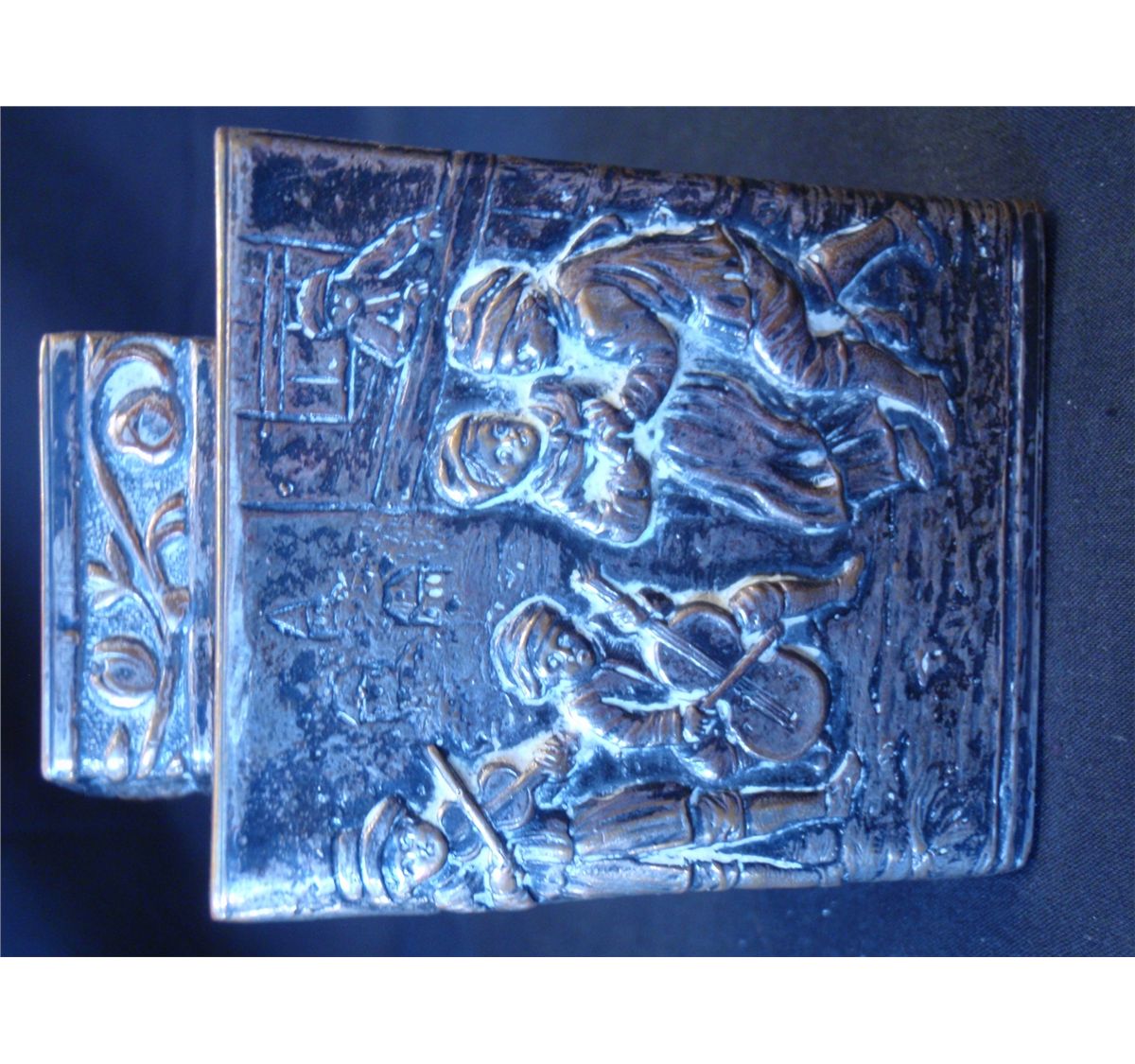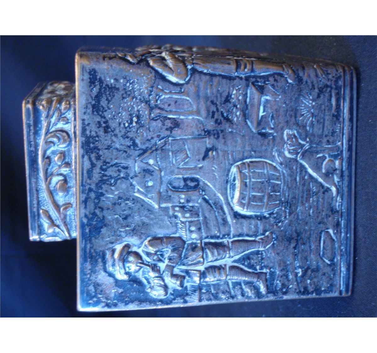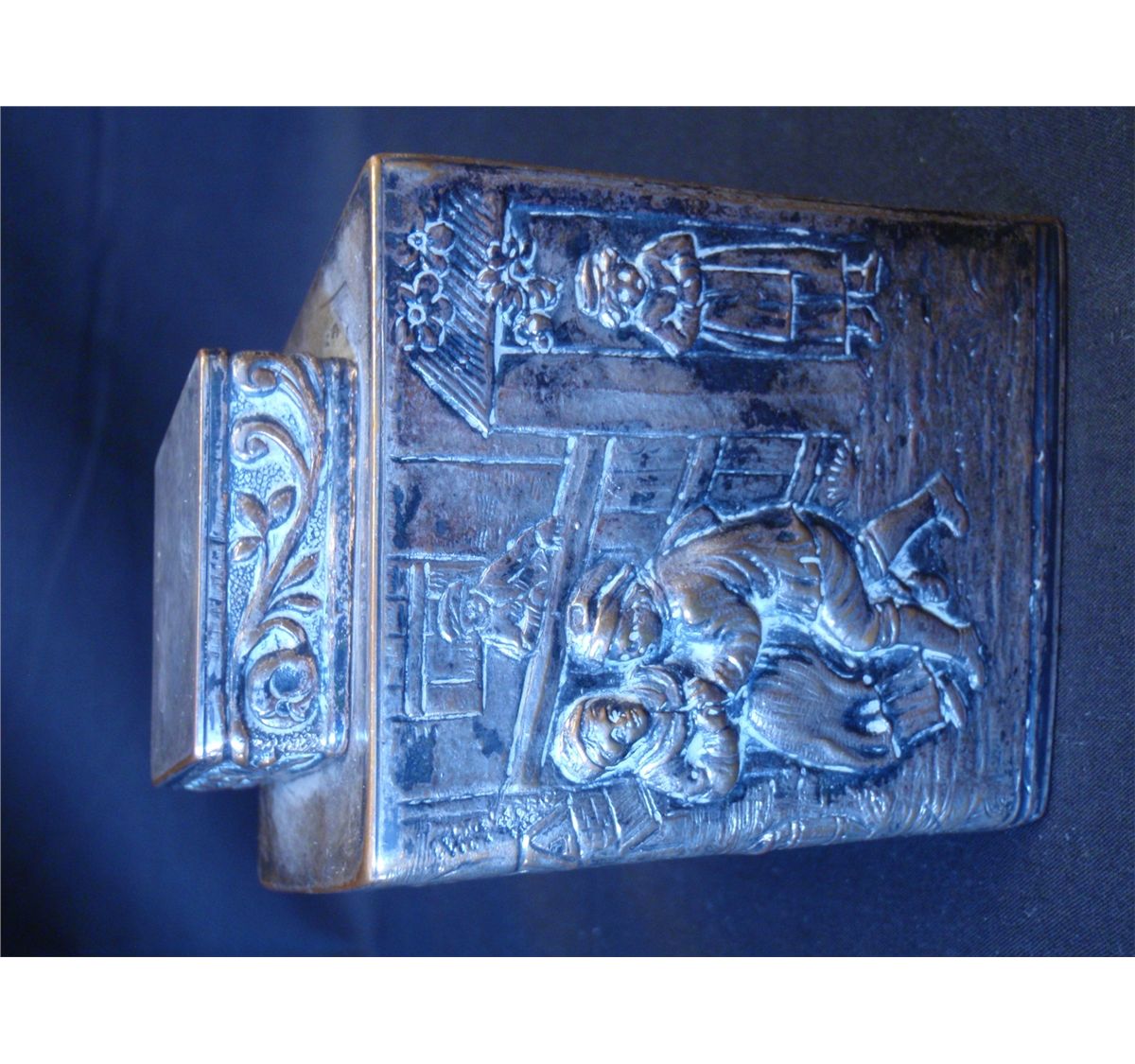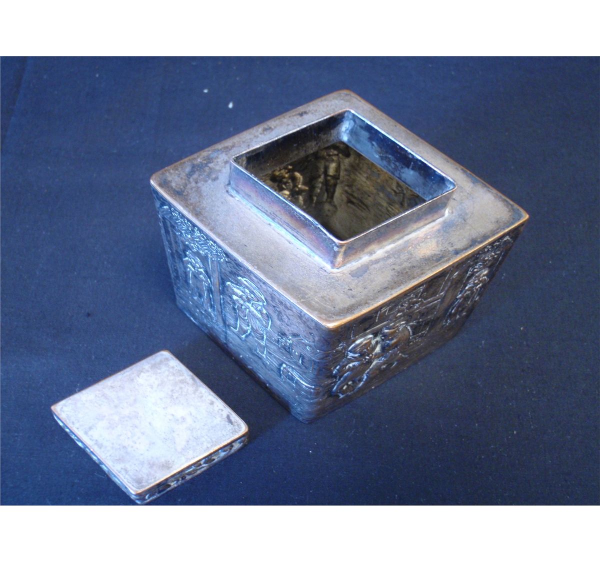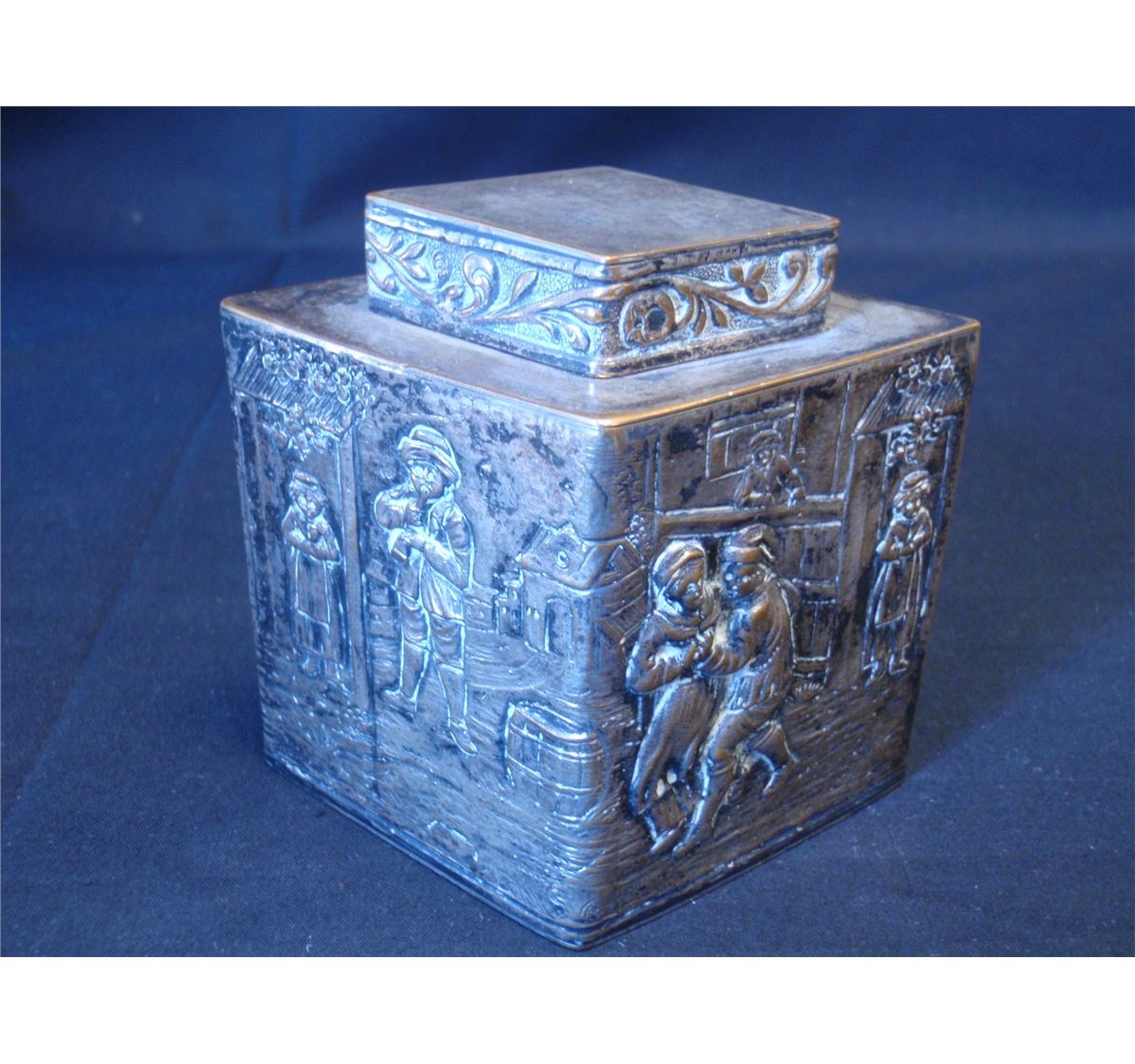Mid to late 19th Century Silver plated over copper repousse tea caddy. Made by E.J. Webster and son Brooklyn New York. Ware exposing copper color is evident. Shipping on this lot: $5.00. Additional Shipping Charges for Lots sent outside of the U.S