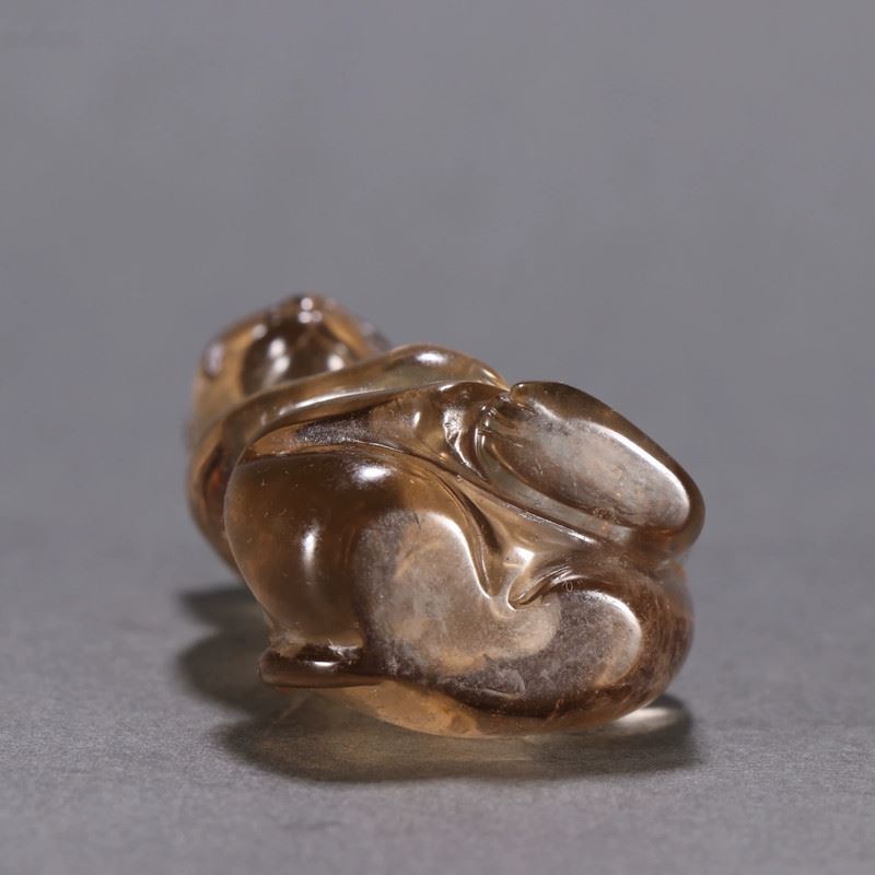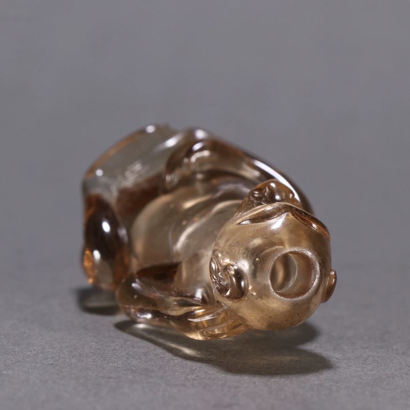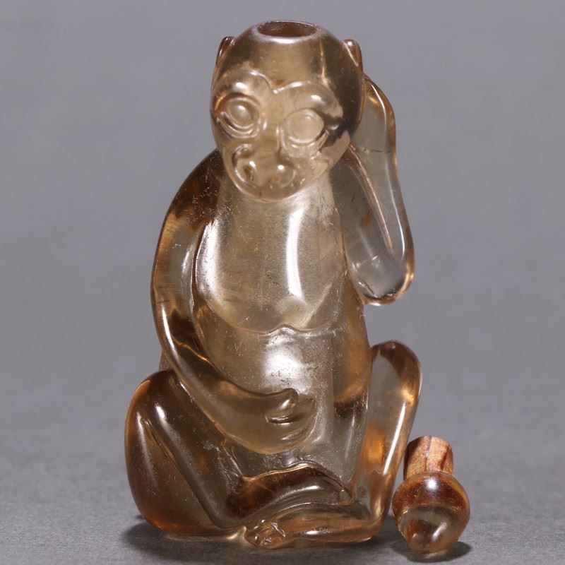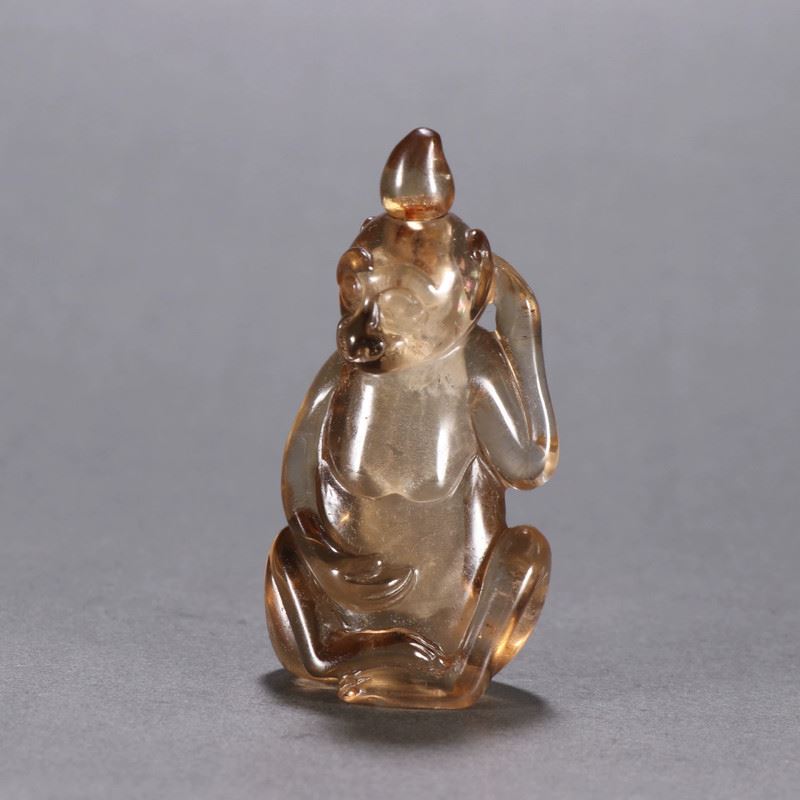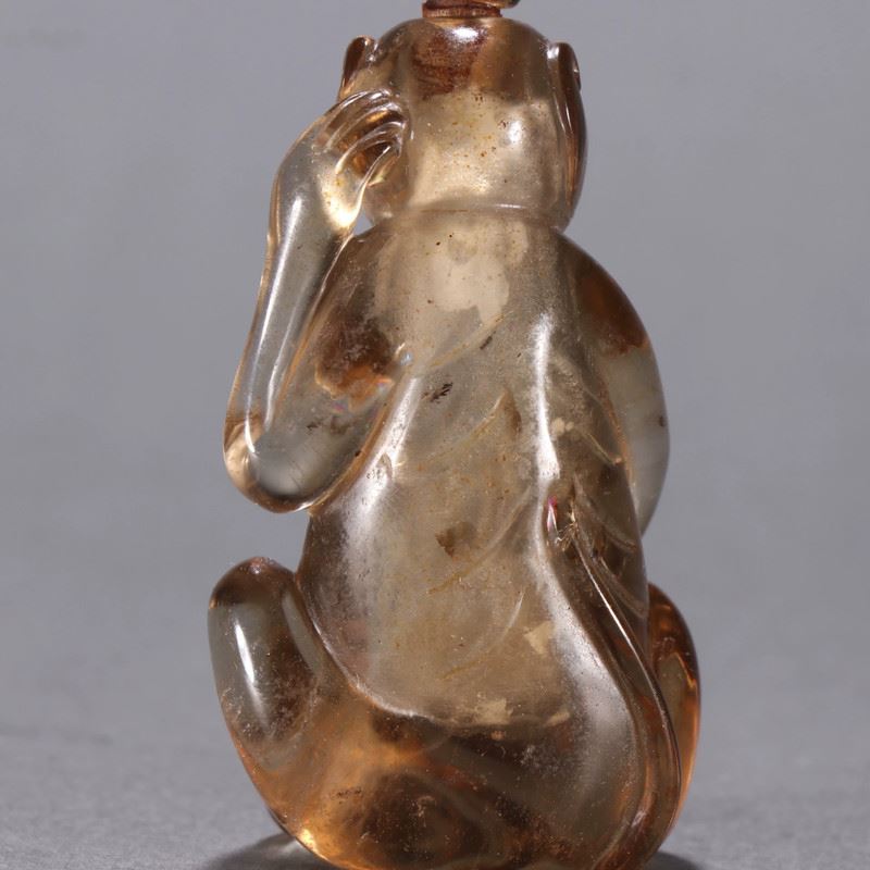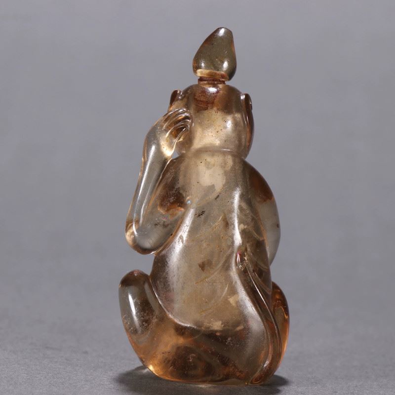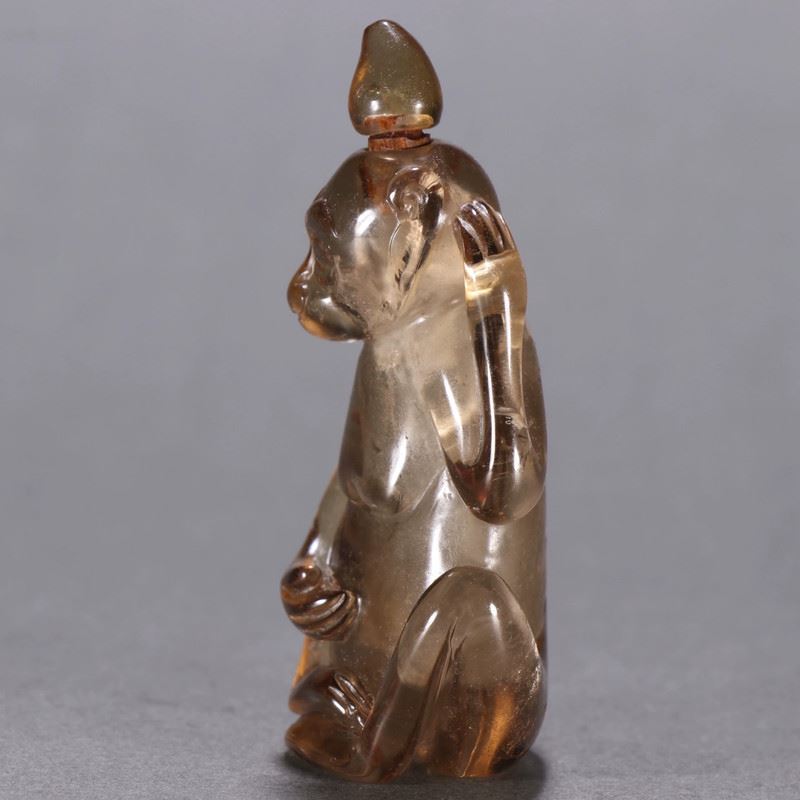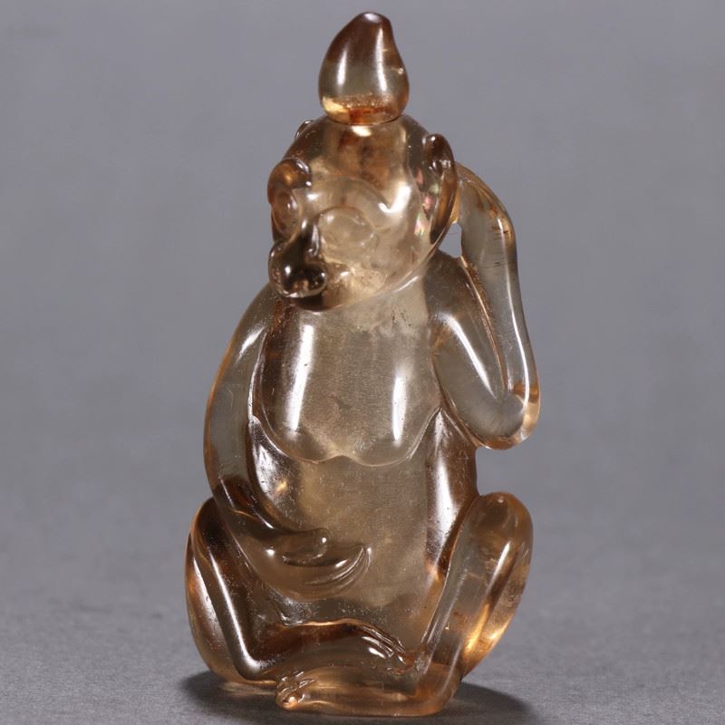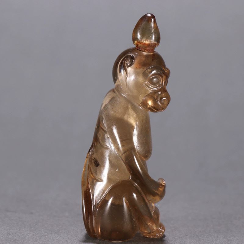This exquisite tea crystal spiritual monkey snuff bottle features intricate carving, depicting a lively monkey with its hand resting on its head in a thoughtful pose. The tea crystal material gives the piece a soft luster and unique color variations, enhancing its artistic and collectible value.