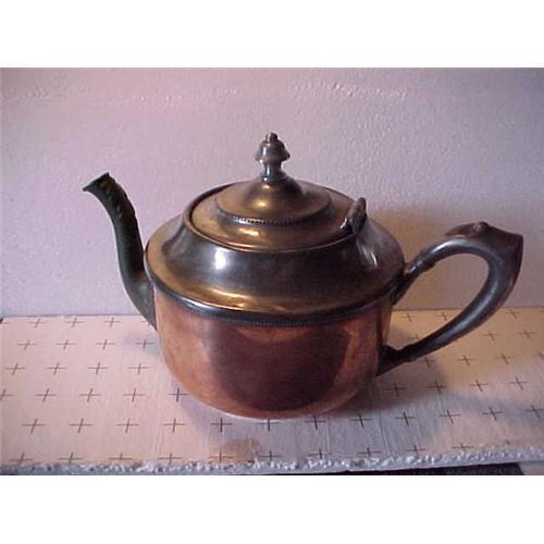 Tea Kettle, brass and Pewter, hinged lid; 5" Diam. copper tank, Pewter Handle,spout and top overall length 9.5"; 6" tall, signed on bottom M.B.Co with bird in cir cle (c) 1800's; no dings, dents etc. Ready for use.