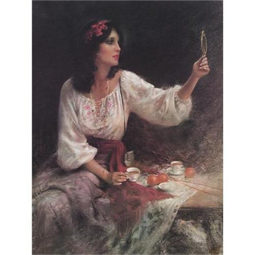 This extraordinarily realistic piece is of a young women looking into a hand mirror while she awaits her company to join her for tea. She wears flowers in her hair and a flowing, long sleeved blouse.