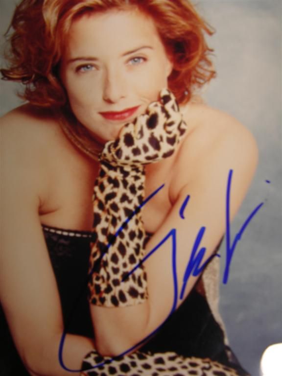 8 x 10 color photo of actress Tea Leoni, signed by her in blue marker. Leoni is seen wearing a strapless gown and leopard skin gloves. A certificate of authenticity is included. (8x10)