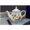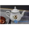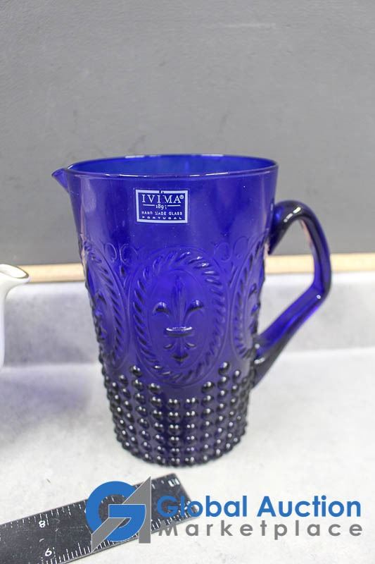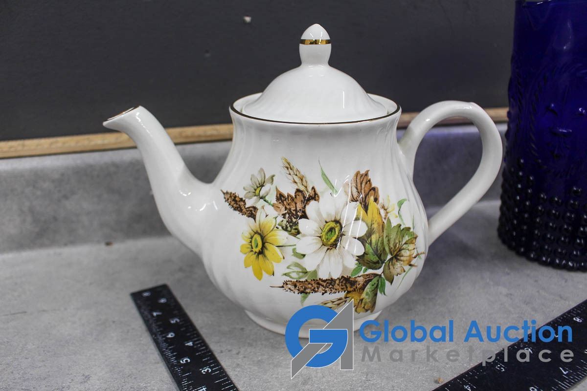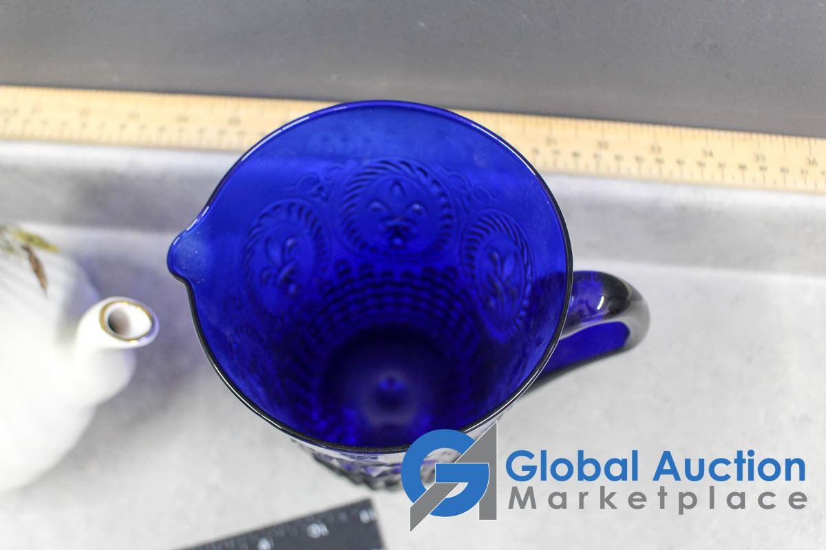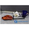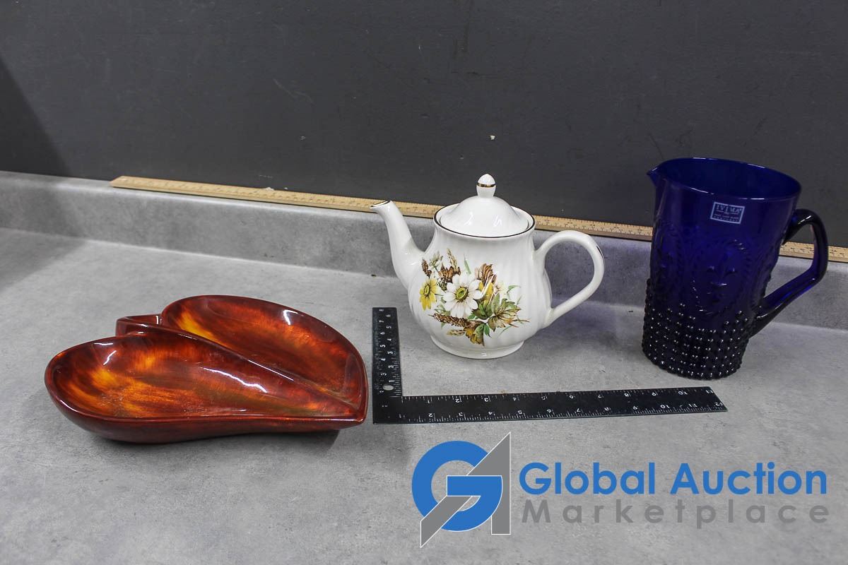 Tea Pot, Blue Glass Pitcher and Ceramic Craft Dish