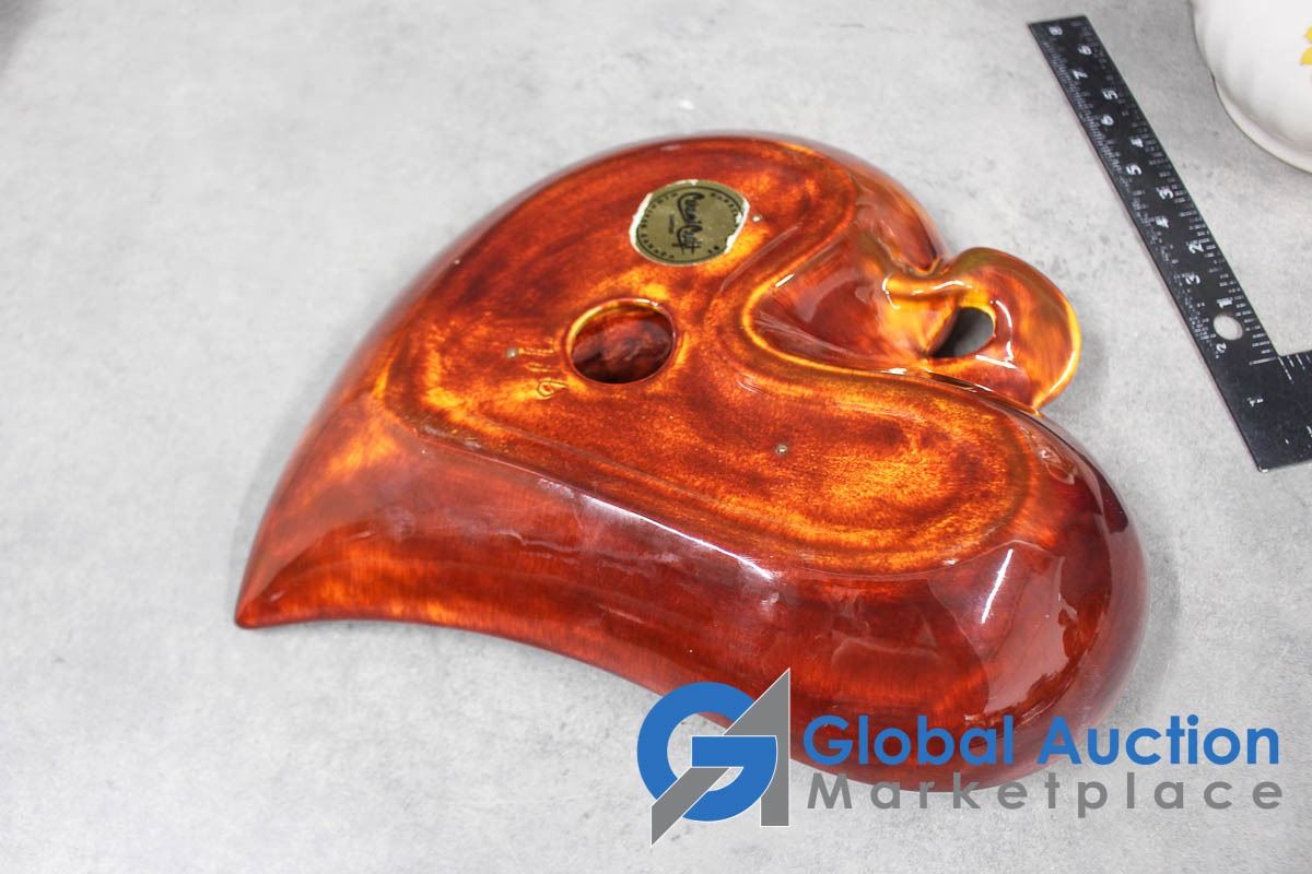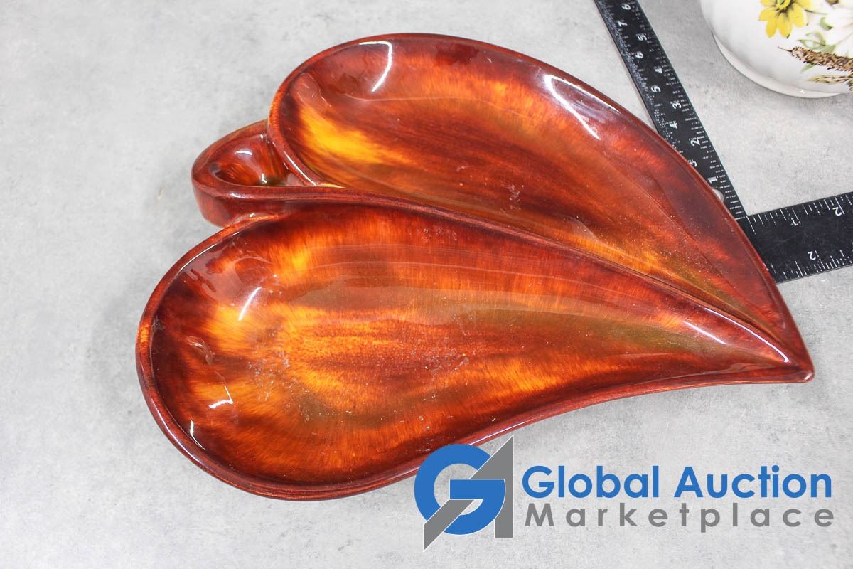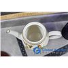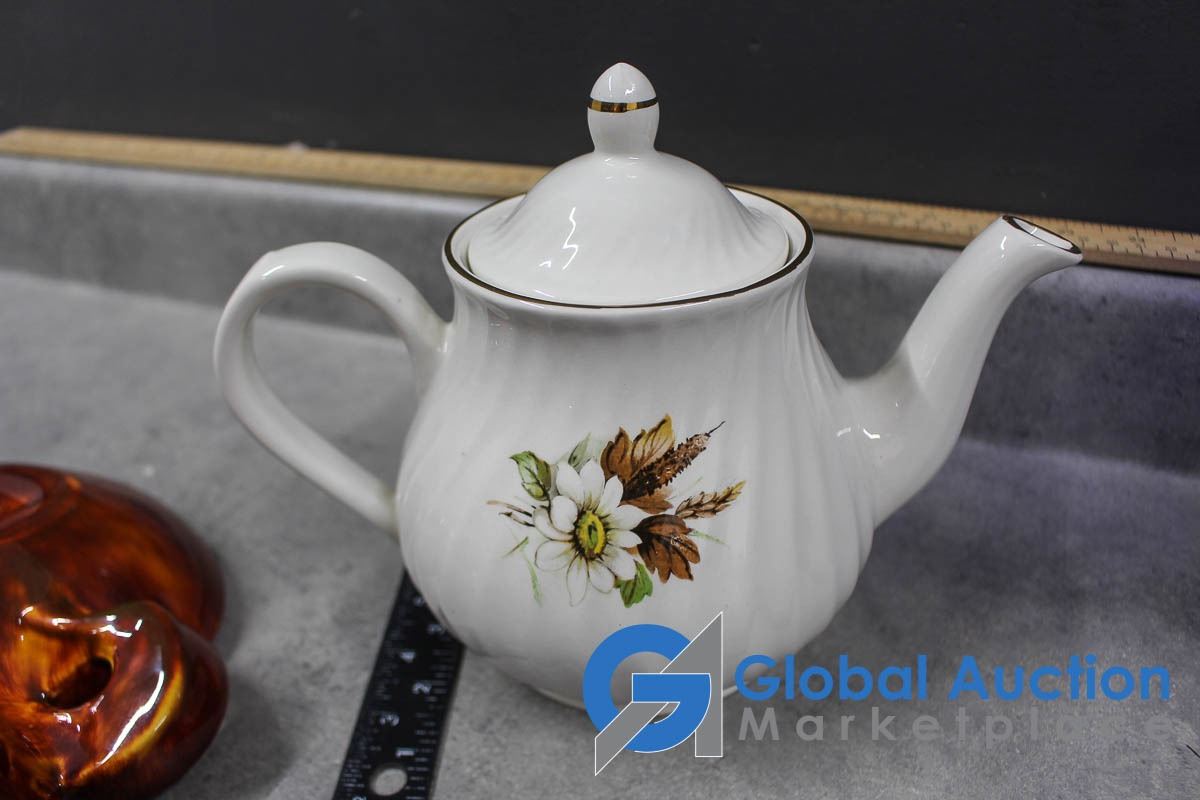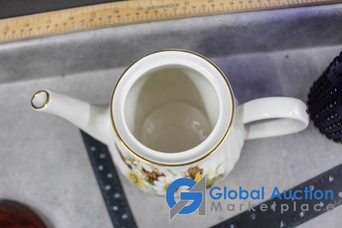 Tea Pot, Blue Glass Pitcher and Ceramic Craft Dish