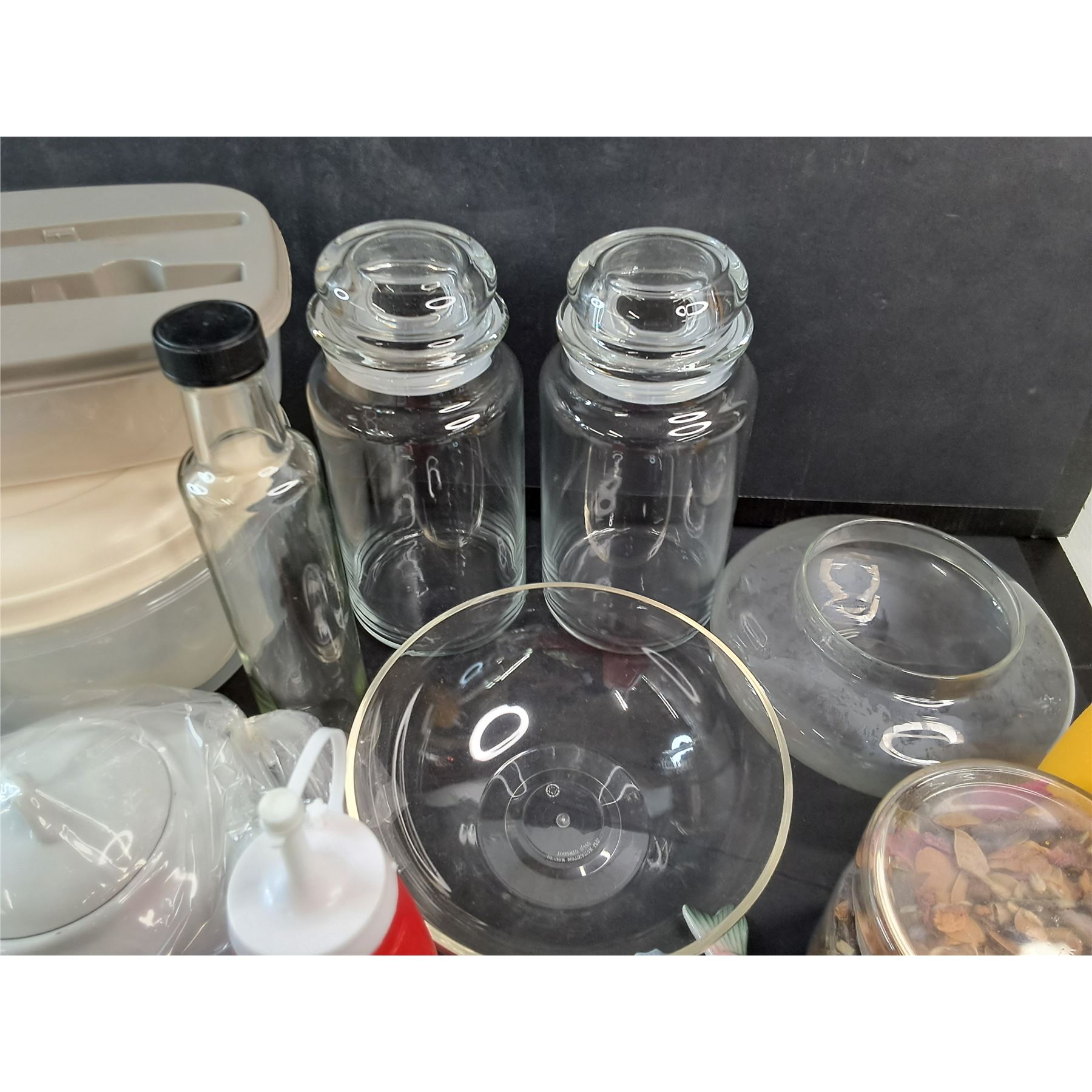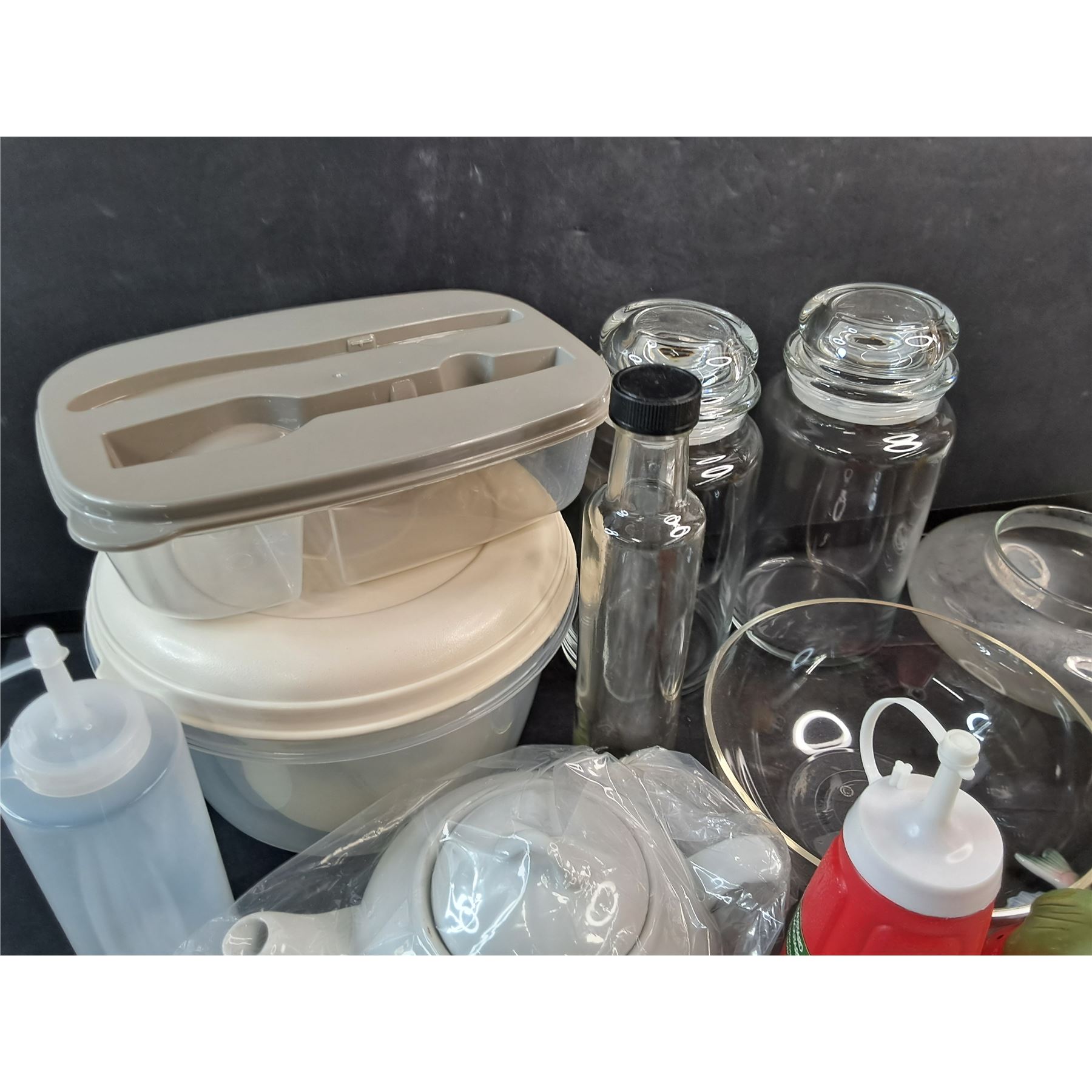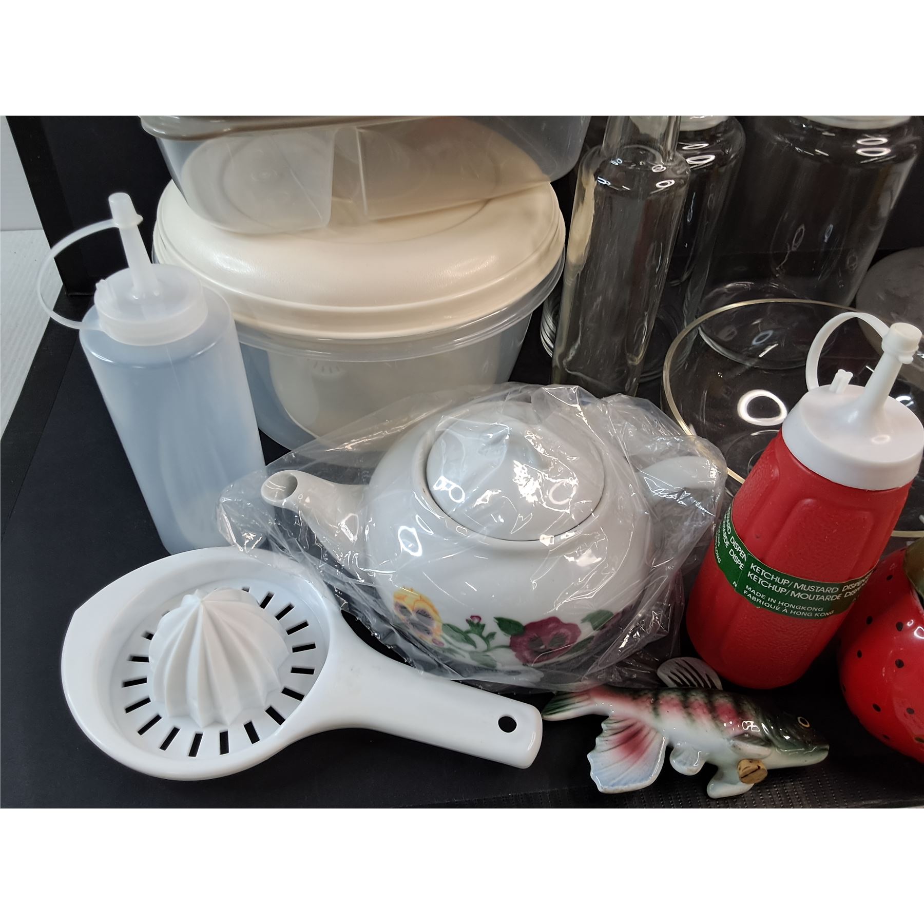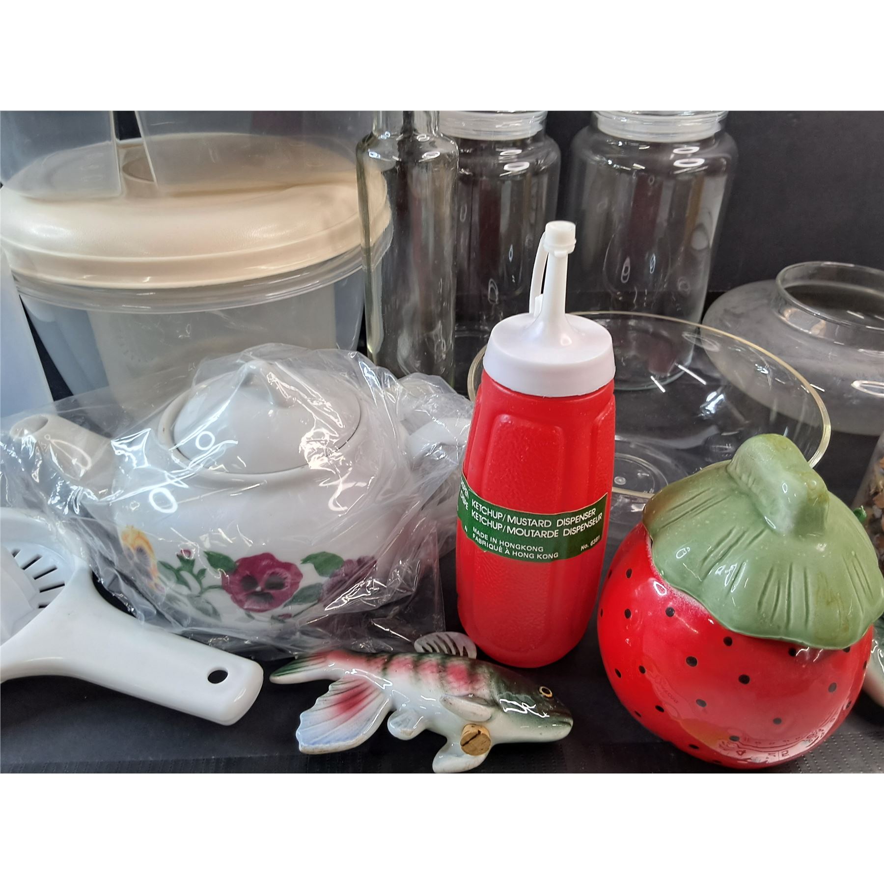 Tea Pot, Jars, Condiment Bottles, Juicer, Salt & Pepper Shakers, Plastic Bowl, Oil Bottle, Misc