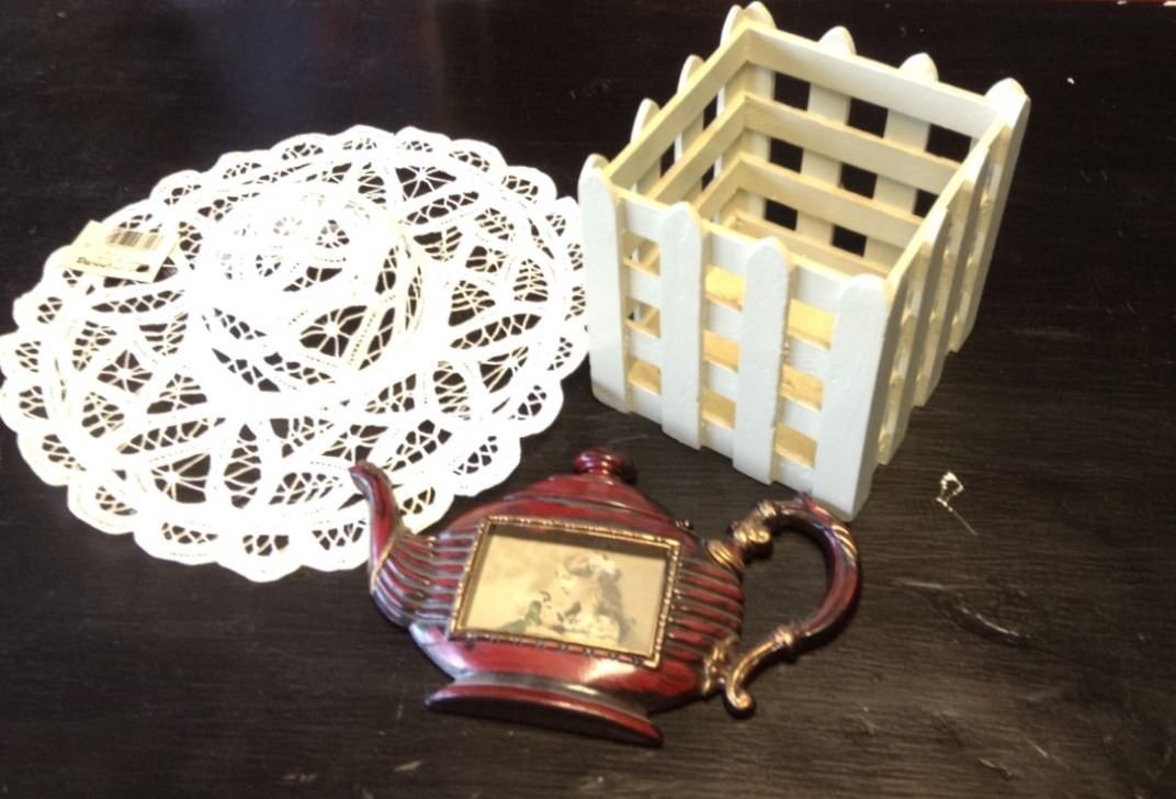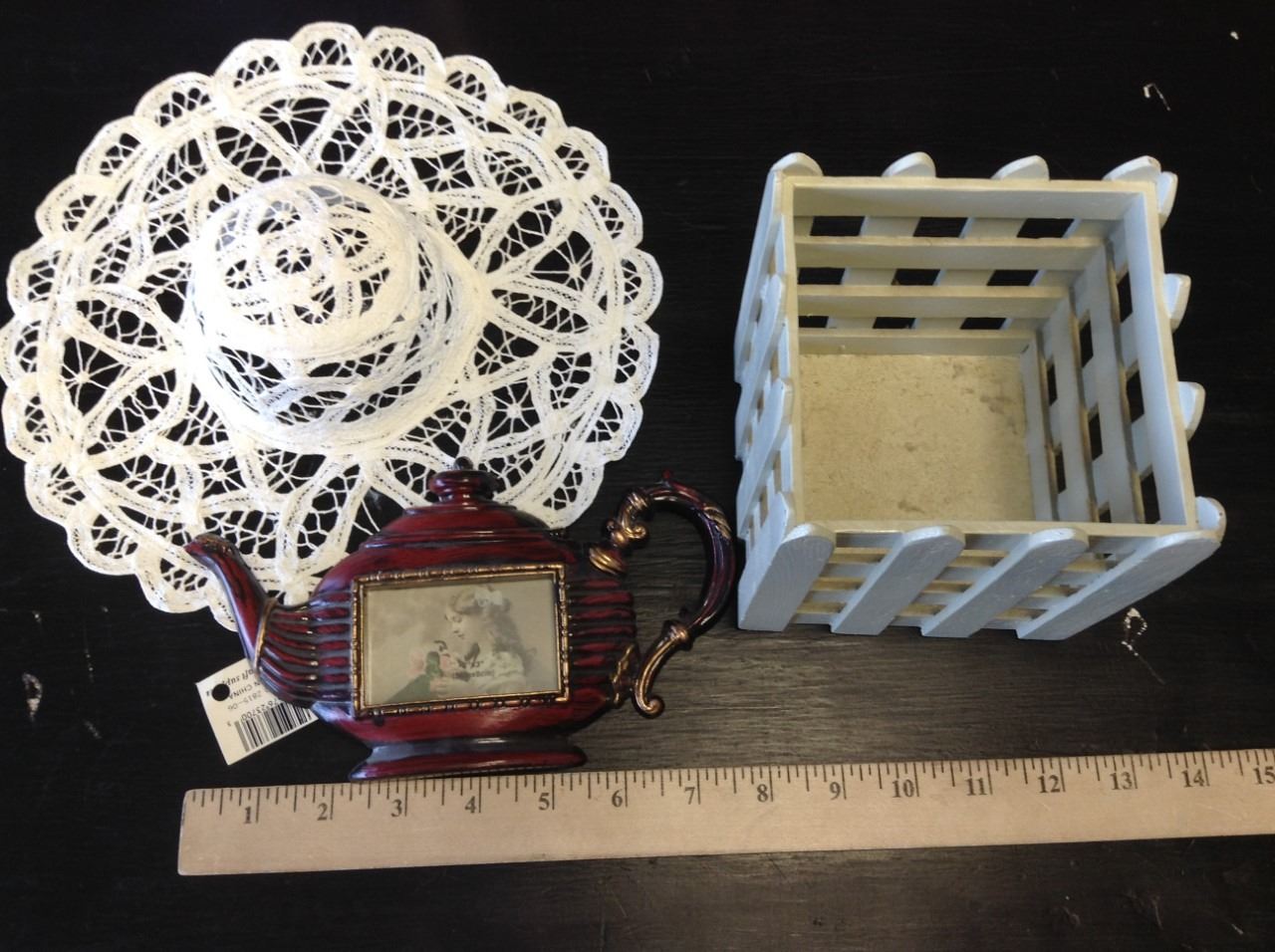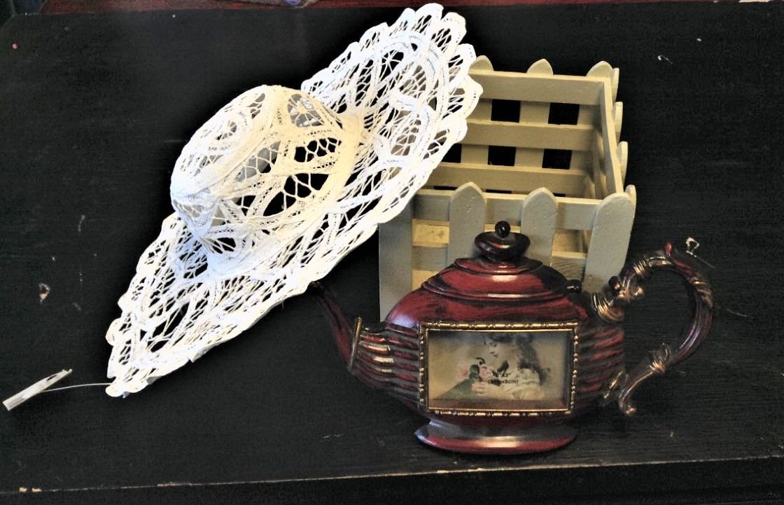 Tea Pot Picture Frame, Lace Hat Wall Hanging and Fence Post Inspired Plant Pot Holder