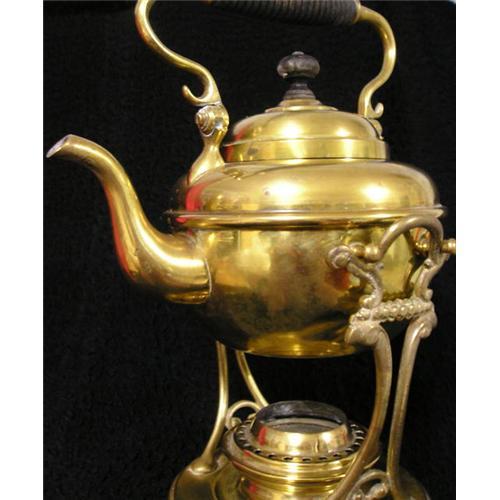 Brass, dents in lower teapot body, wear on handle and lid tip. Still a beautiful piece.