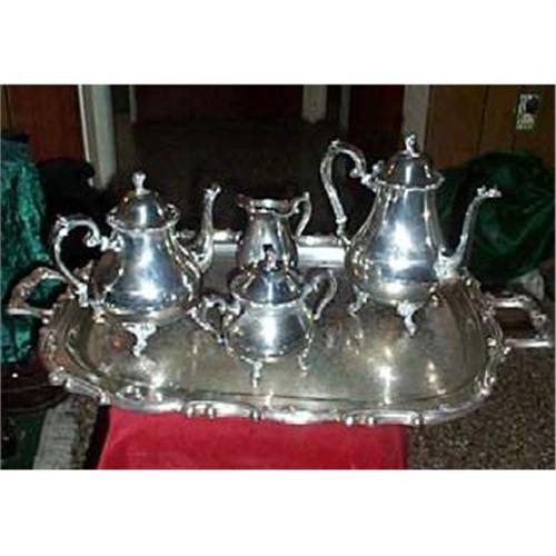 Attractive 5 piece set consisting of coffee pot ~ teapot ~ creamer ~ covered sugar ~ with matching associated tray ~ attractively engraved ~ The tray measures 27 " X 17 X 2 3/4"h. ~ Teapot 9"h. ~ The coffee pot is 10 "h. X covered sugar 6 1/4"h. X creamer 5 1/4 "h. Lovely accent and so useful for the Holidays ~ Will need to be polished.