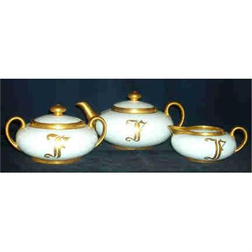 Teapot,Covered Sugar and Milk Jug. Marked Z.S.& Co. Bavaria. Hand Painted gold trim and "F" Initial. Teapot is 4" high X 7.1/2" from spout to handle. Sugar is 3" tall and 5.3/4" handle to handle. Creamer is 2" tall and 4.3/4" from spout to handle. Dainty, and never used.