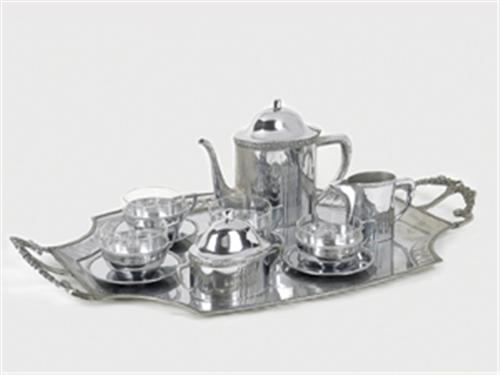 Nickel-silver, tray with handles, teapot, sugar box, milk jug, 4 pieces of teacups with saucers, glass lining, Austrian, circa 1930, Argenton sign, worn, damaged.