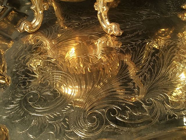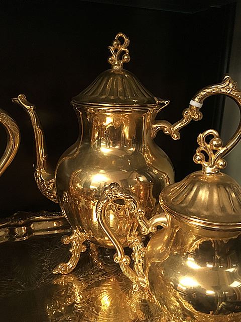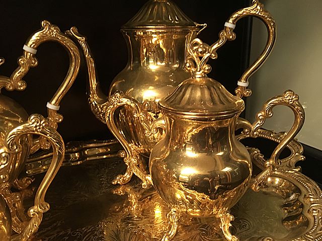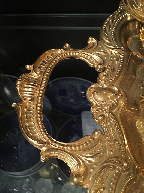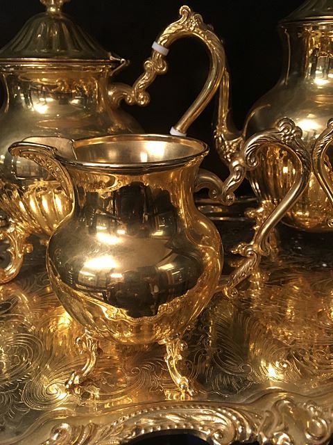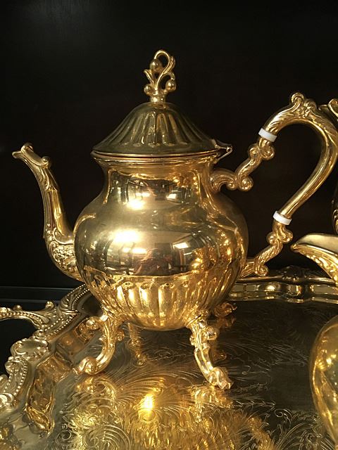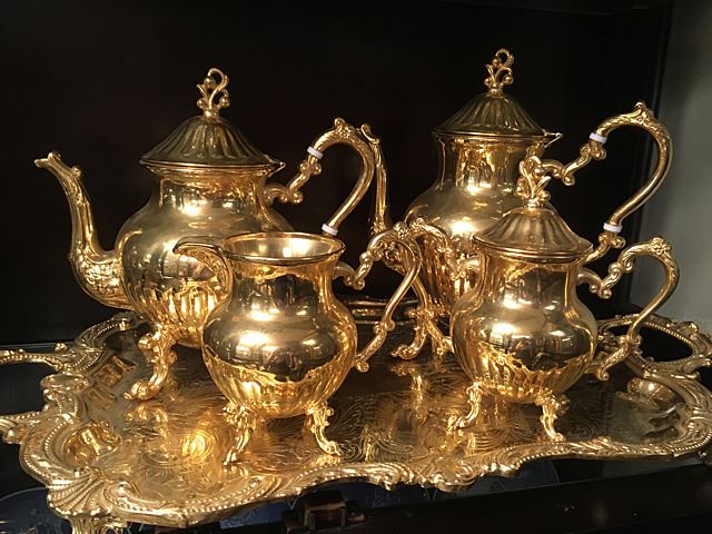 Beautiful ornate tea service in gold wash, includes coffee and tea pots, creamer, sugar and serving tray. Coffee and Tea pots have white decorative enamel on handles. Very ornate and beautiful tea service.