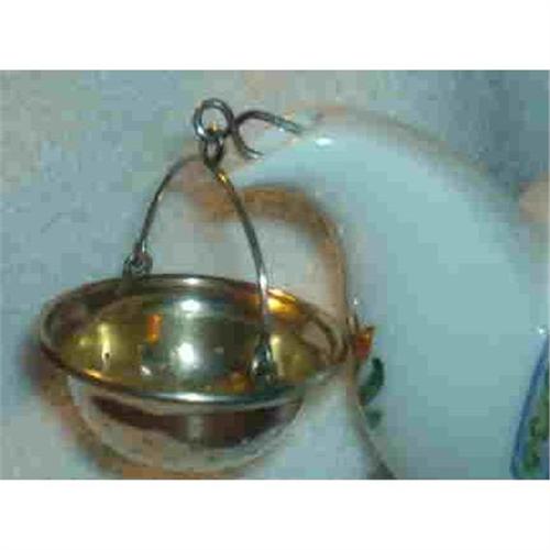 This strainer dates to the 1930s, it has a gilded interior. The hairpin like end is inserted into the spout of the teapot and the tea passes through it into the cup. All loose tea leaves will be caught in the strainer.