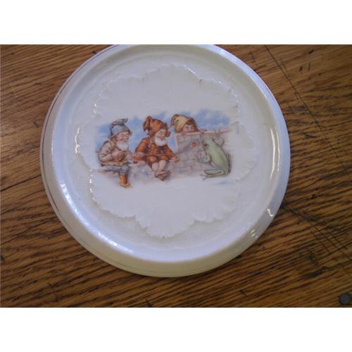 This is just adorable.Looks like three little brownies or elves teasing a frog with a peacock feather.Graphics are great.Minor wear on the gold band around edge.No chips or cracks.Probably made in Germany but is un-marked.Measures 6 1/2" across.