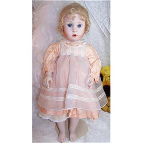 * this charming doll is wearing a gorgeous peach dress and lacey apron - her long, blonde hair is done up neatly in a bun w/just wisps of curls peaking through - all of which is highlighted by her striking blue eyes, the blush on her cheeks to match her dress, and her delicate and painted lips