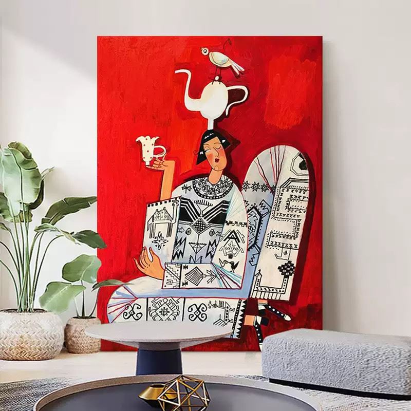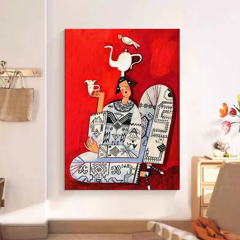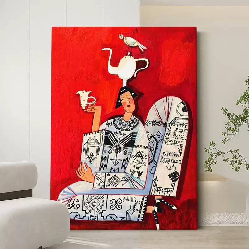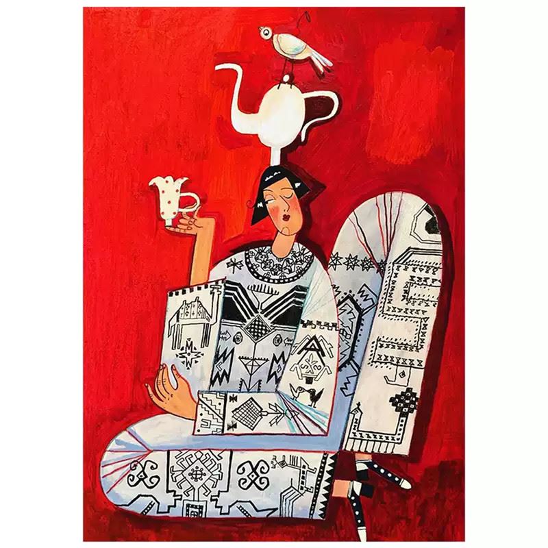 This artwork portrays a whimsical character in a moment of serene balance, surrounded by intricate patterns. The woman sits comfortably, holding a cup, while a teapot and a bird rest atop her head, creating a playful yet harmonious scene. The bold red background adds vibrancy, complementing the detailed black-and-white designs of her attire. This piece blends simplicity and complexity, offering a visual interpretation of peaceful equilibrium. Dimensions: 28 x 39 inches.