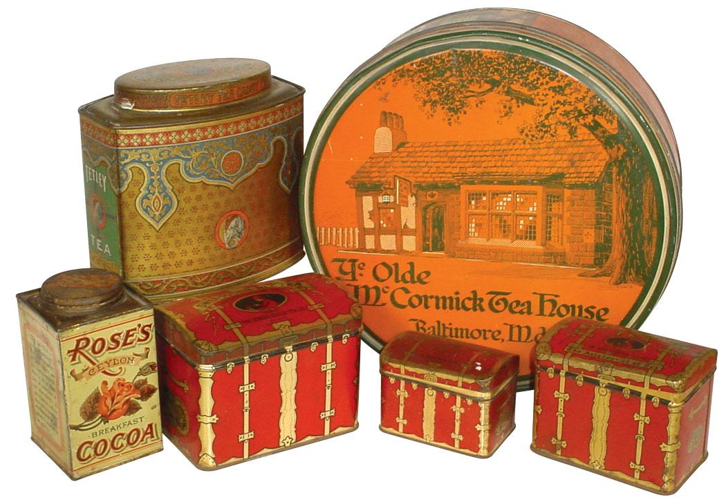 Tea & cocoa tins (6), Tetley Orange Pekoe Tea, McCormick's Orange Pekoe, (3) Swee-Touch-Nee-Tea tea
