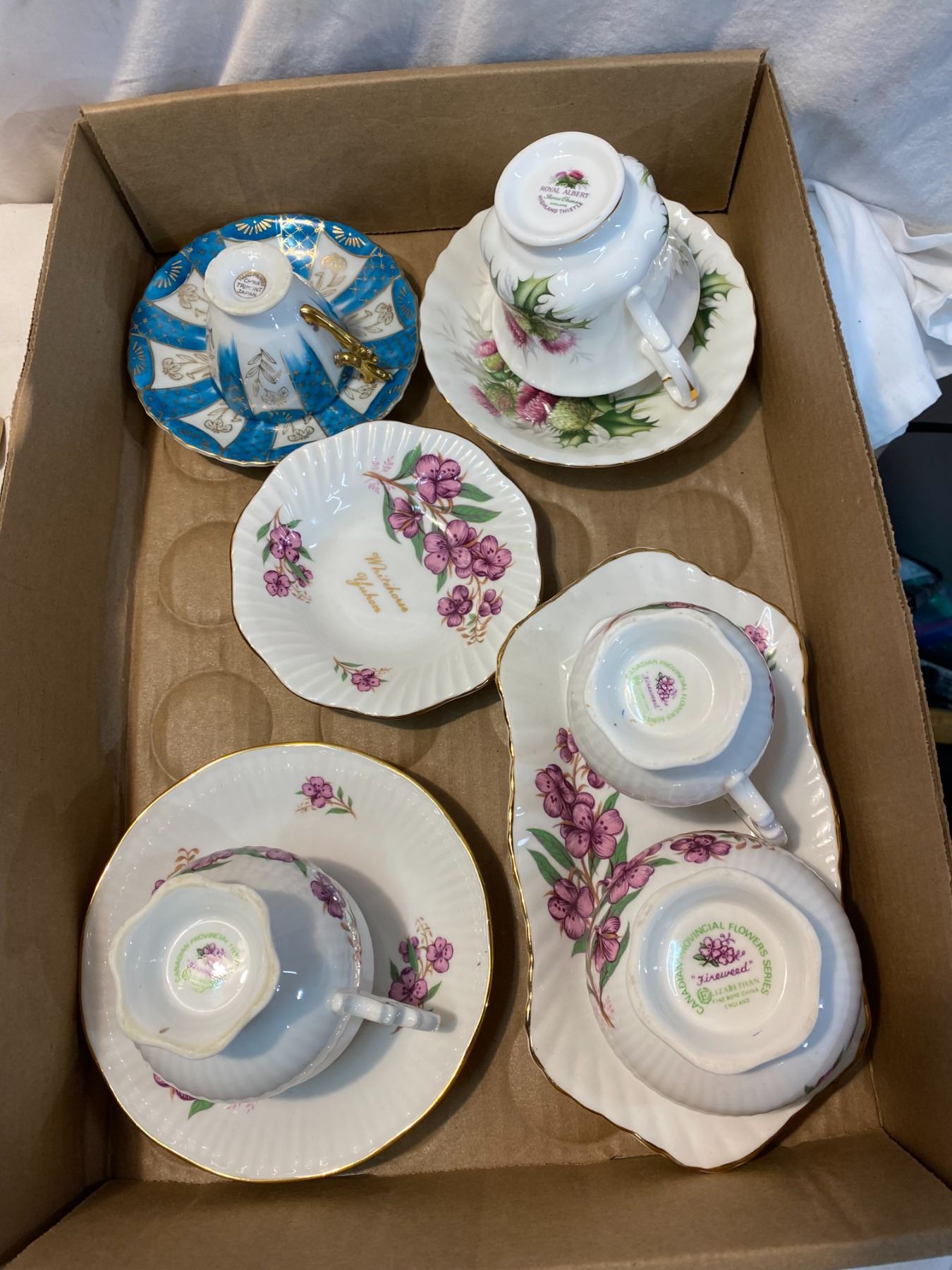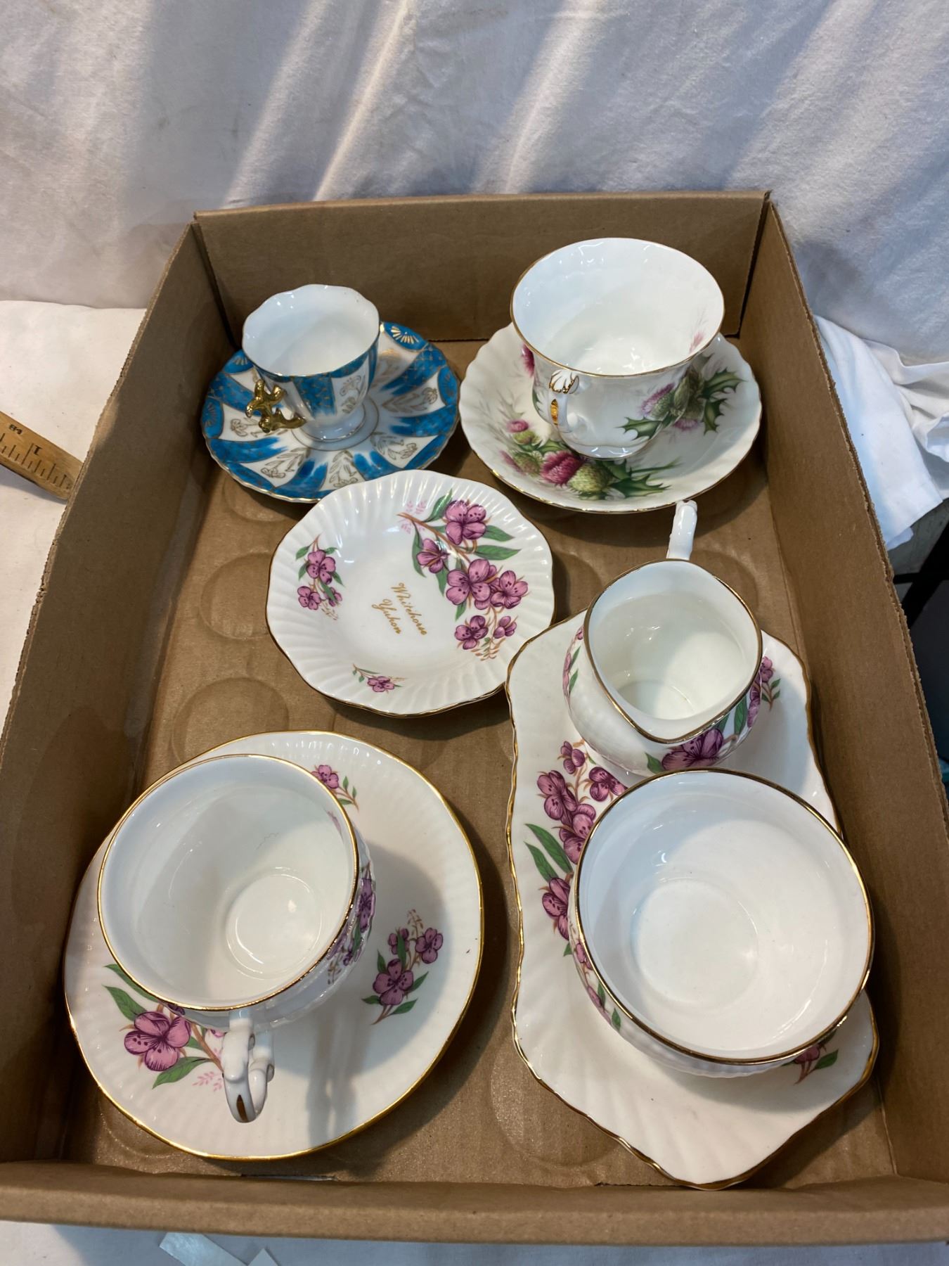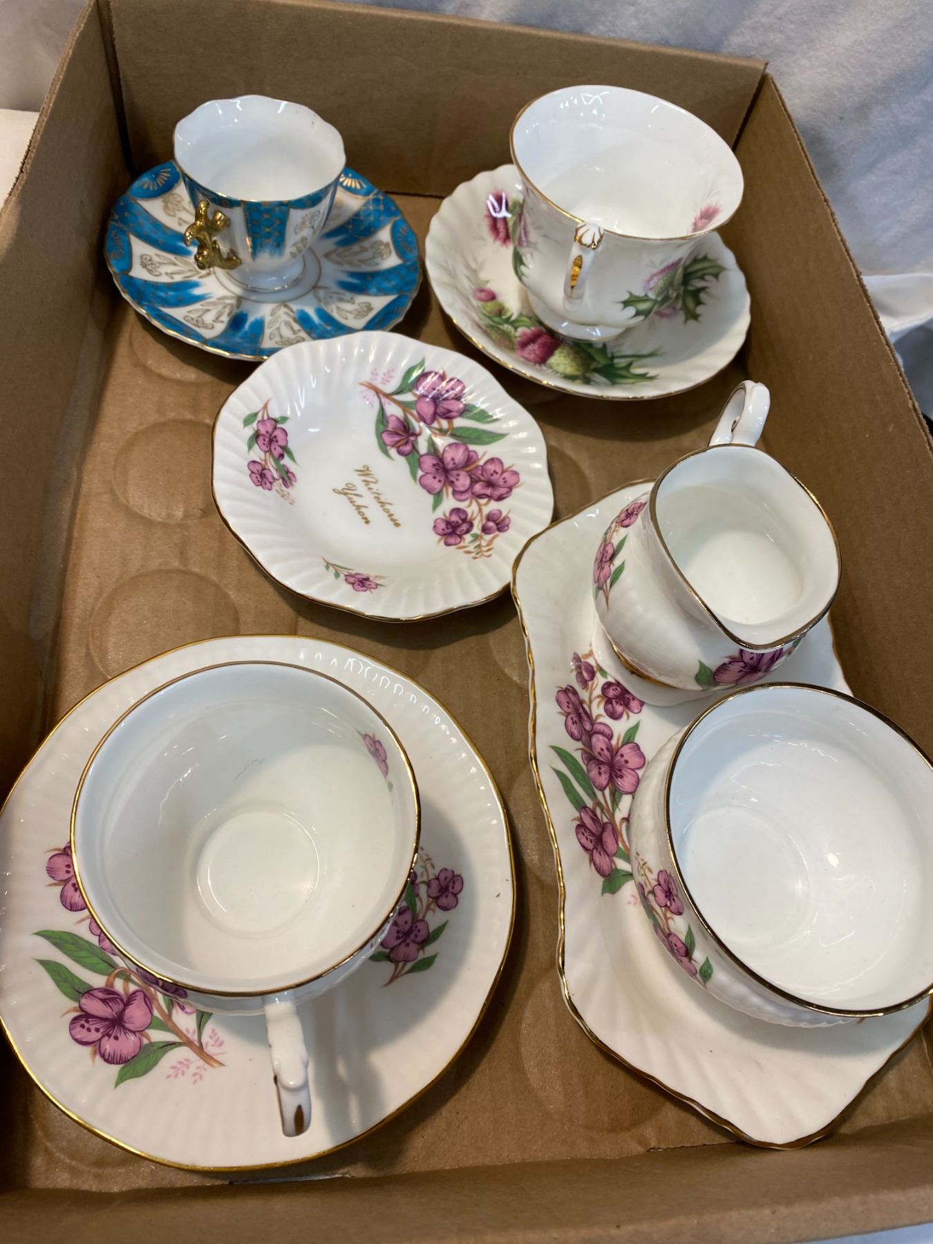 Tea cups and saucers, cream and sugar etc