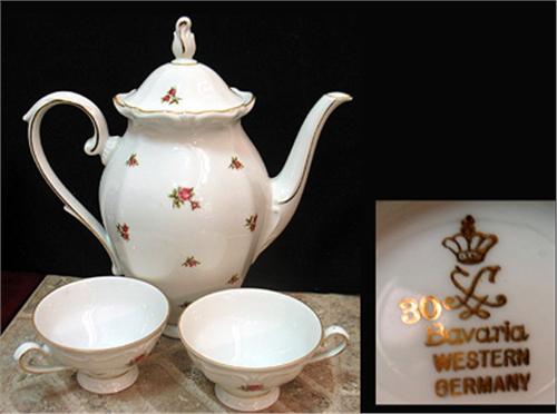 Tea for two. Teapot and two cups marked Bavaria, Western Germany. Crown mark is Oscar Schaller & Co successor 1918 - present. No chips, cracks or crazing