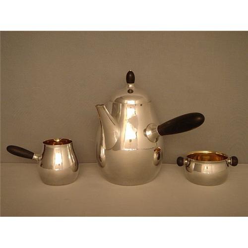 This coffee set is an absolute classic made by the Danish firm Georg Jensen in the 1930s. It is sterling silver and the milk and sugar are guilded inside. It has ebony wood handles and finial.The craftsmanship is, as always with Jensen superb. The design, quality and condition are excellant. It is a good size holding 5 + normal teacups ~ circa 2 pints ~ circa 1 liter.