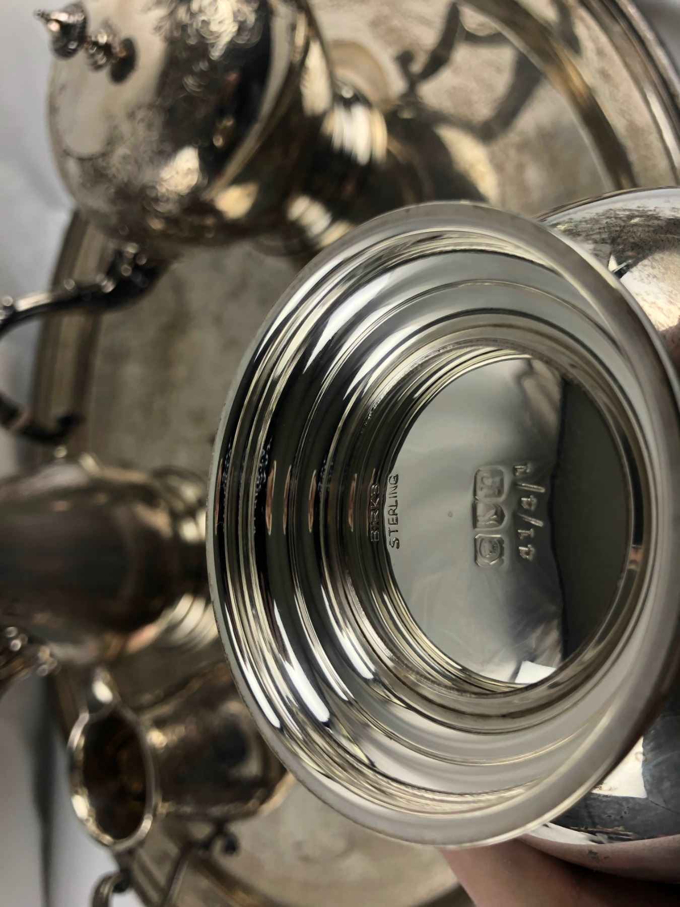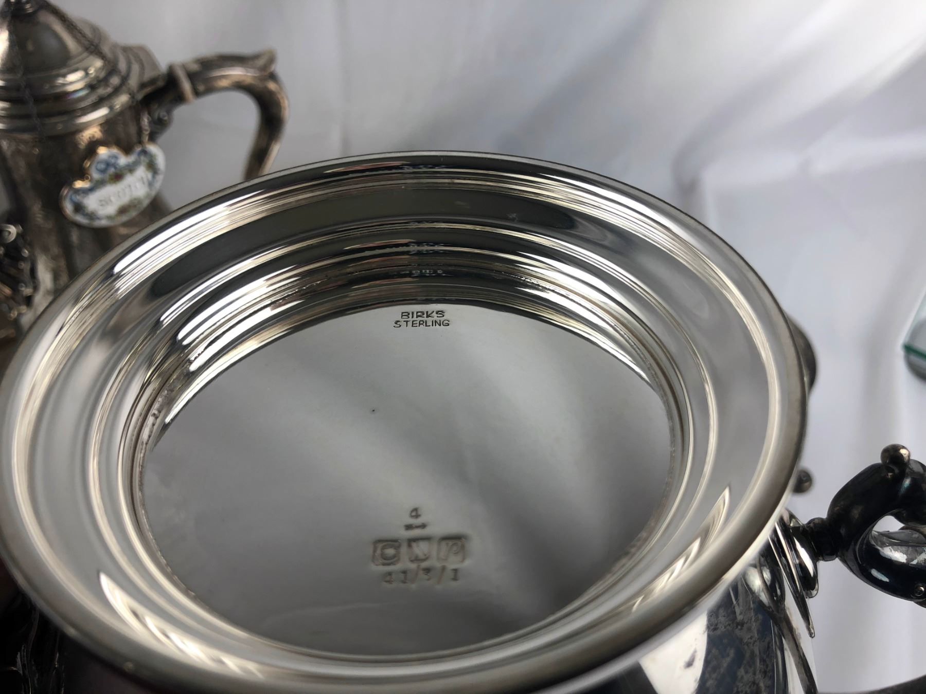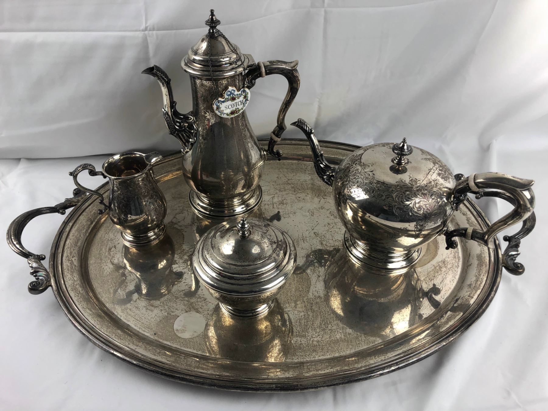 Birks stepling tea set & tray - Creamer 4.5" height x 2" wide - Sugar bowl 5" height x 4.5" wide - Teapot 7" height x 4.5" wide - Pot #2 11.5" height x 3.5" wide - Tray 24" length x 18.5" wide 3 ceramic lables