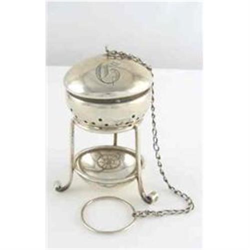 A pretty little teaball and stand Monogrammed with a "G" or "C".Sterling and in perfect condition made by the Simmons Bros who were out of business by 1908.
