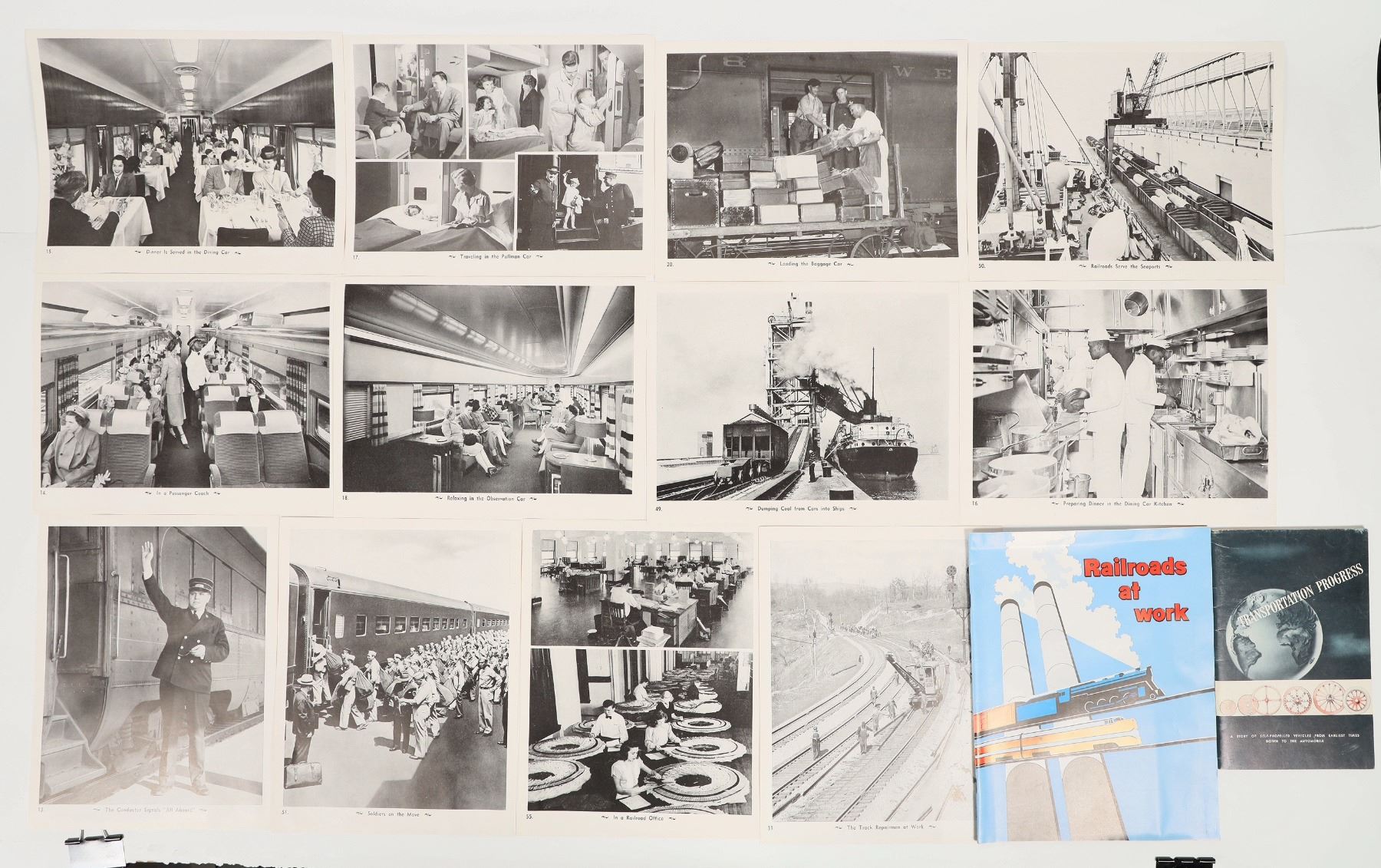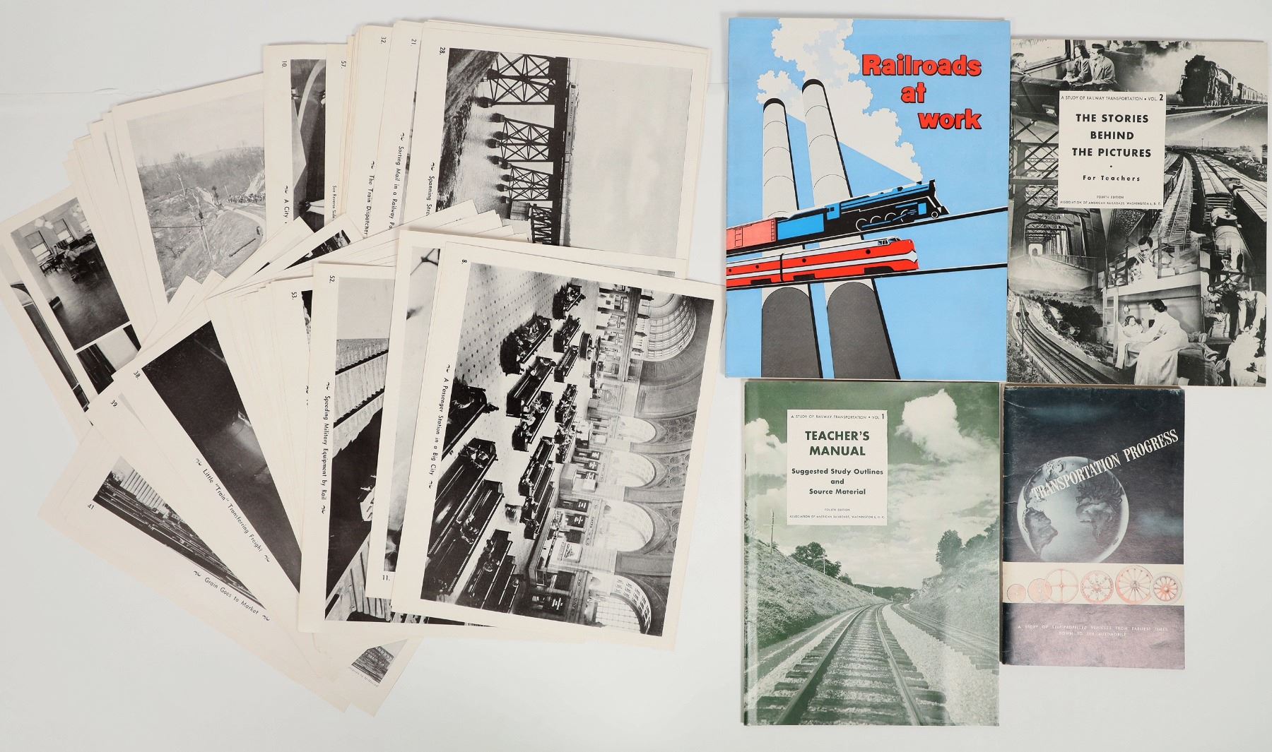 Teacher's Kit on the topic of Railroad Transportation, containing labeled pictures, quiz & answers, and other light classroom material. Set has not been inspected for completeness. Pieces are in generally good condition, with approximately 100 pages of ephemera. Most picture pages measure 8.5x11", with some smaller inclusions, like the quiz book measuring about 3x3". Carrying folder is in fair condition, with significant wear on the corners and button fastener missing, please inspect. Includes a separate booklet with a brief history of Transportation Progress in very good condition. Pages appear to be unread with light wear to outer cover. History booklet measures 5.25x8.35". Good condition, see photo.
