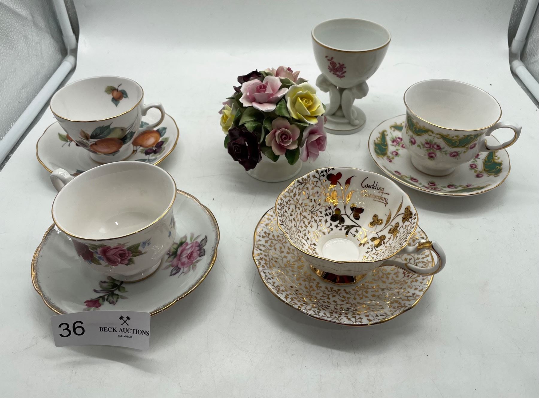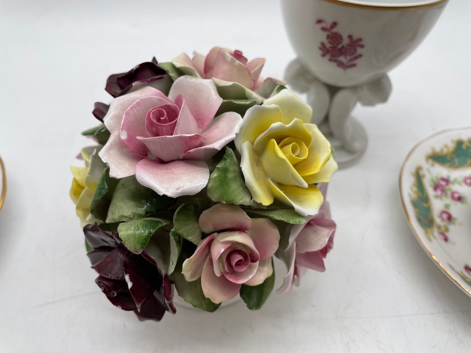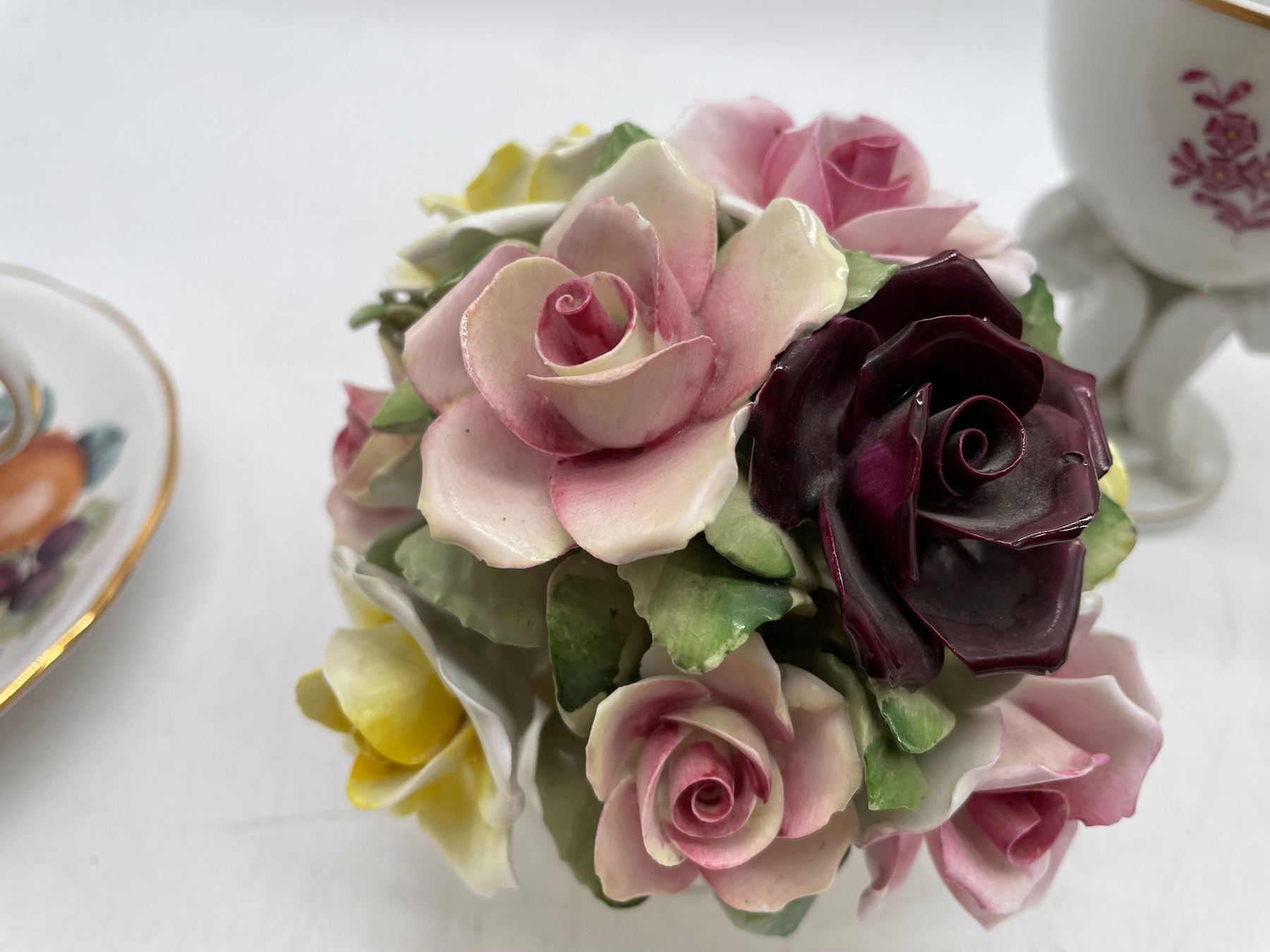 Queen Anne teacups and saucers x 3, 1 x royal Vale apricot teacup, 1 x Capodimonte bouquet with various small chips, 1 x Hungarian trinket dish signed and numbered.