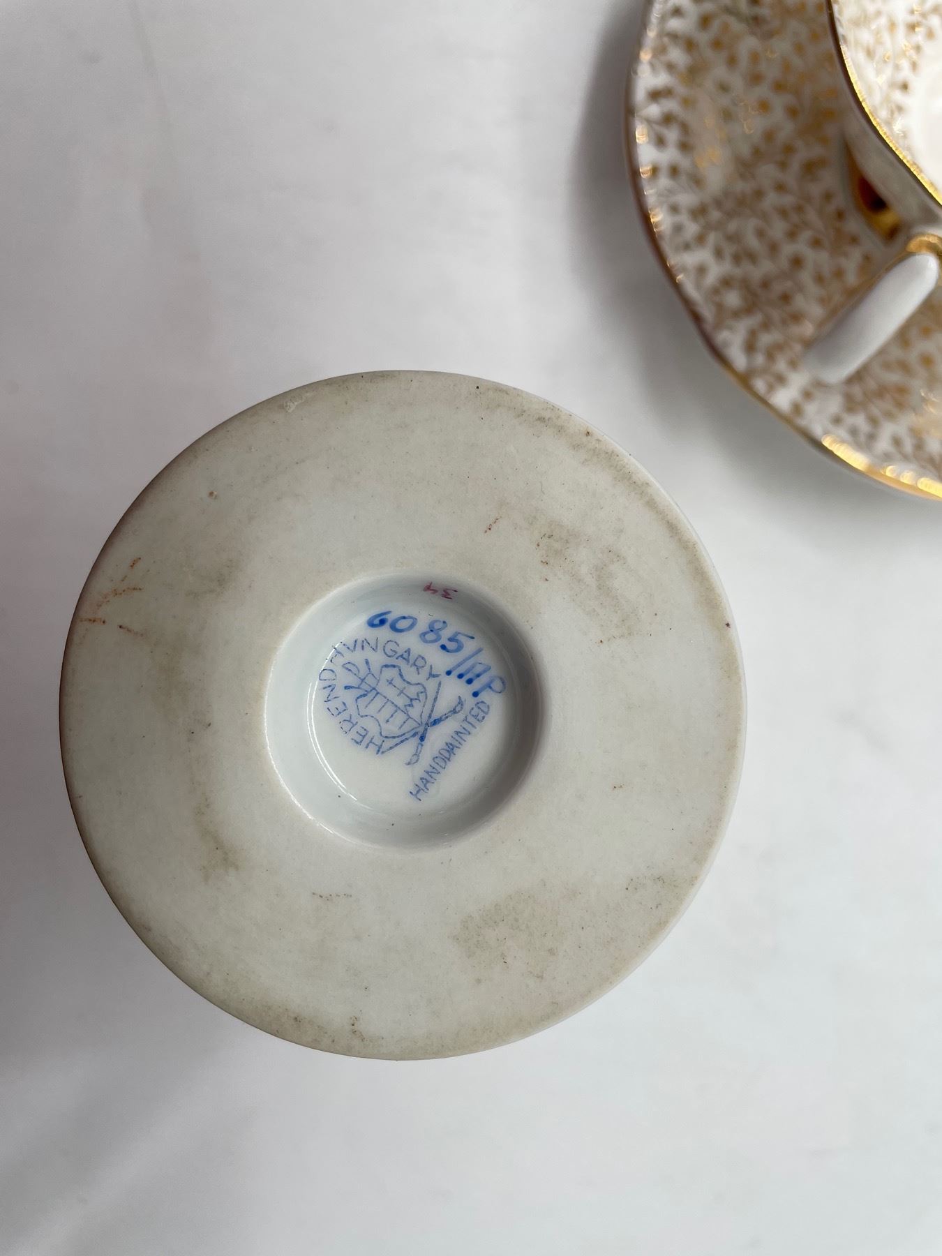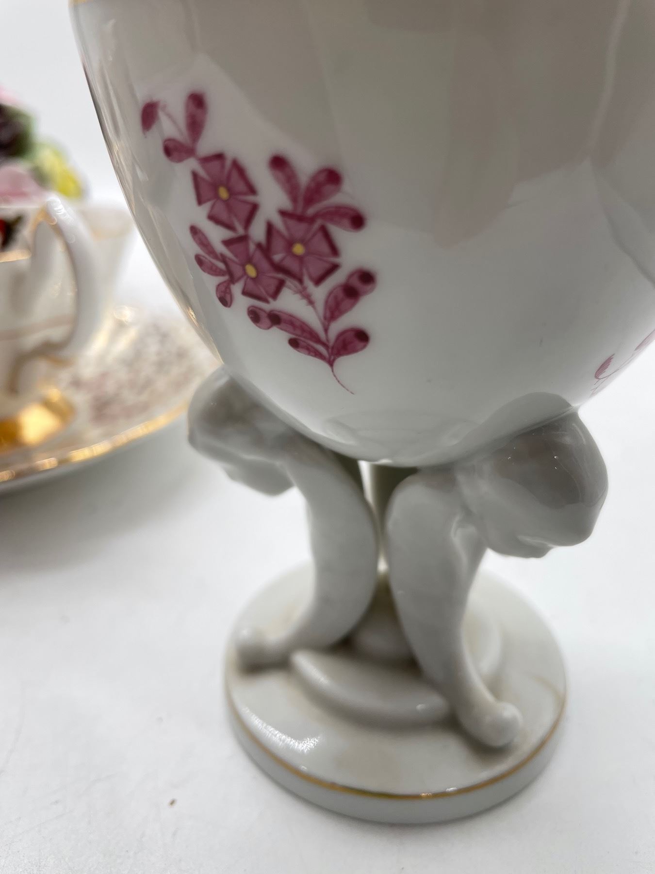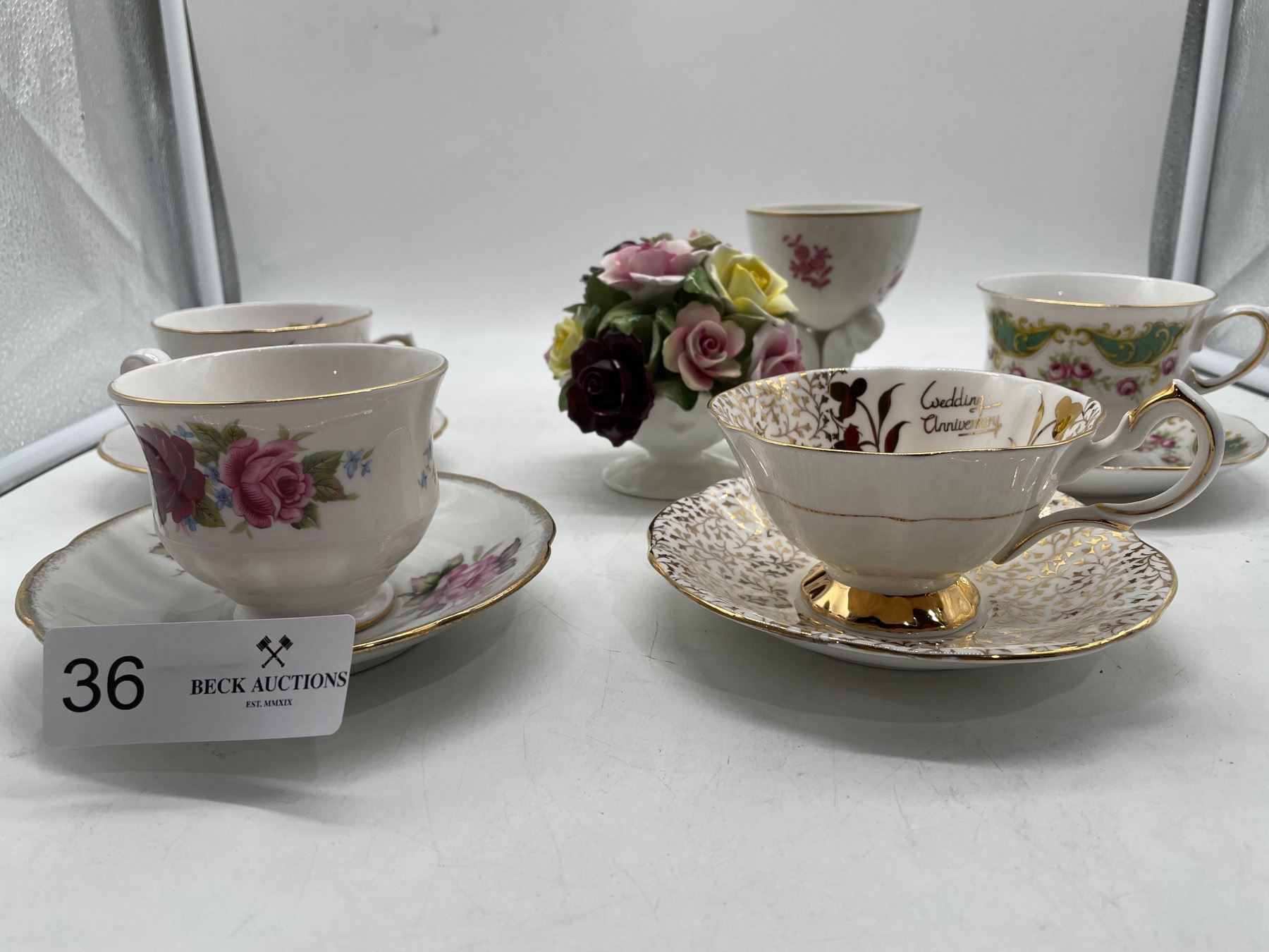 Queen Anne teacups and saucers x 3, 1 x royal Vale apricot teacup, 1 x Capodimonte bouquet with various small chips, 1 x Hungarian trinket dish signed and numbered.