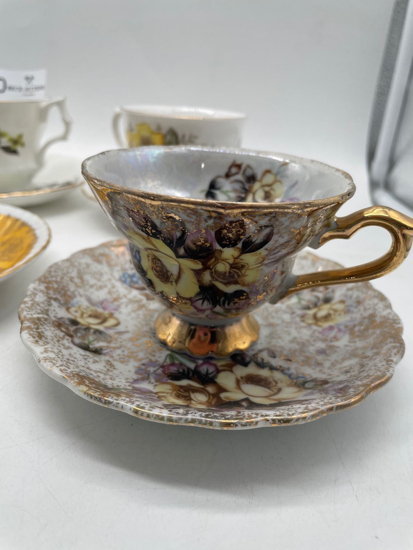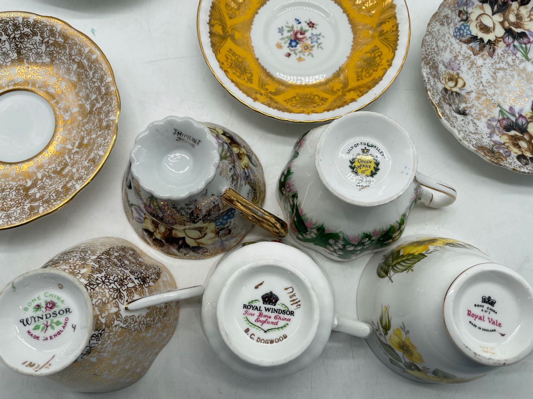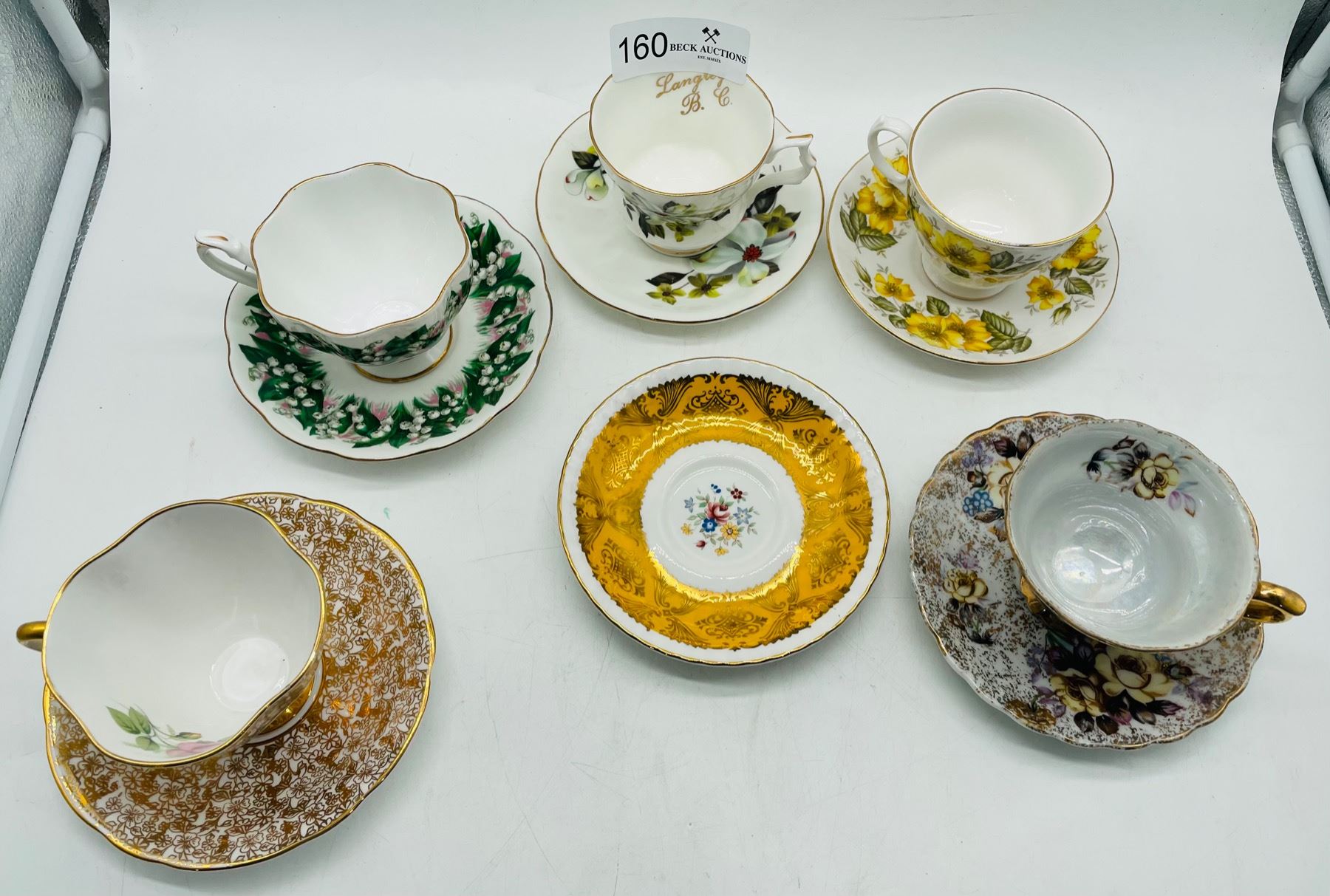Lot of five different teacups with matching saucers. There is one orphan Paragon saucer. No chips or cracks.