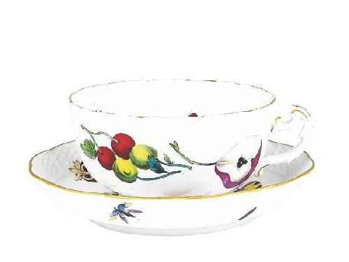 Porcelain, colour painting and gilt. Wicker work rim (ozier). Baroque handle. Fruit and butterfly decoration. Marked: Herend, 1836, Fischer Móricz Diameter of the saucer: 17 cm, height of the cup: 6.5 cm