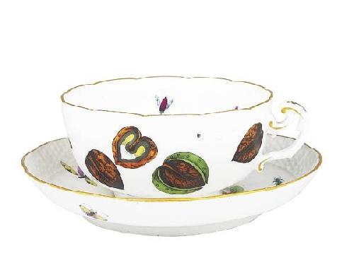 Porcelain, colour painting and gilt. Wicker-work rim (ozier). Baroque handle. Fruit and butterfly decoration. Marked: Herend, 1863, Fischer Móricz. Diameter of the saucer: 17 cm, height of the cup: 6.5 cm