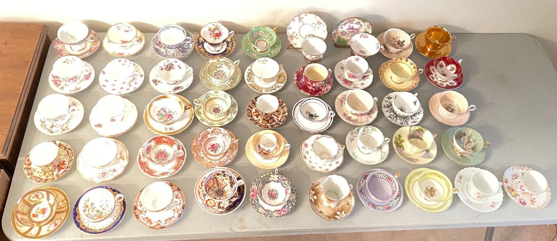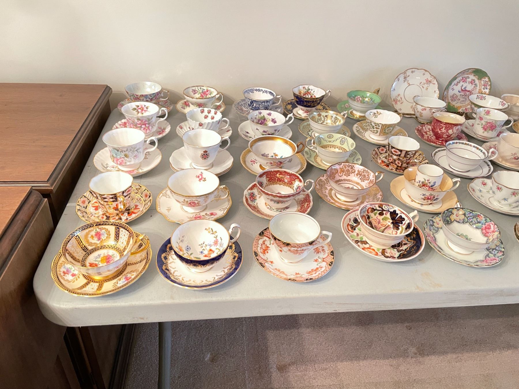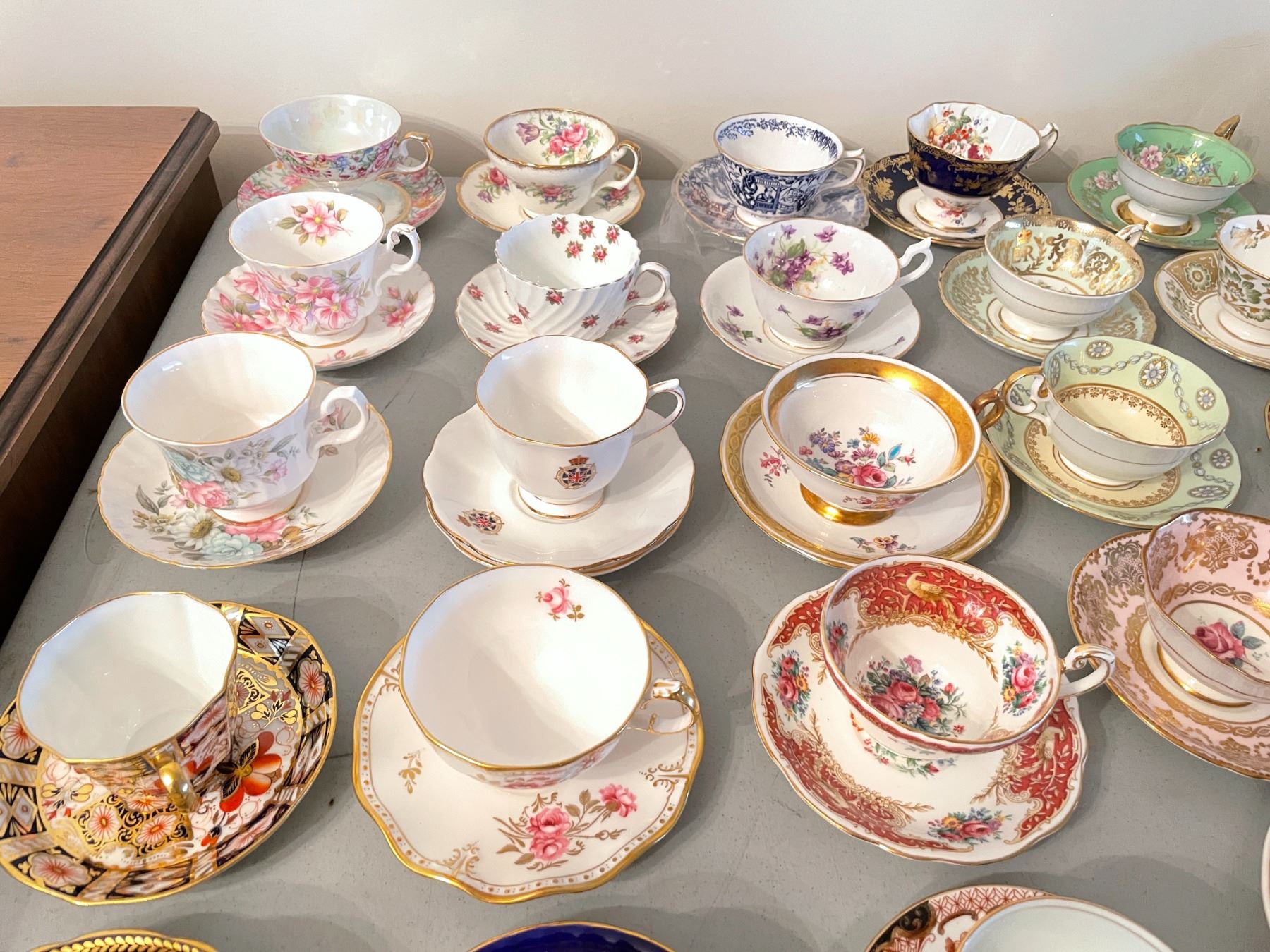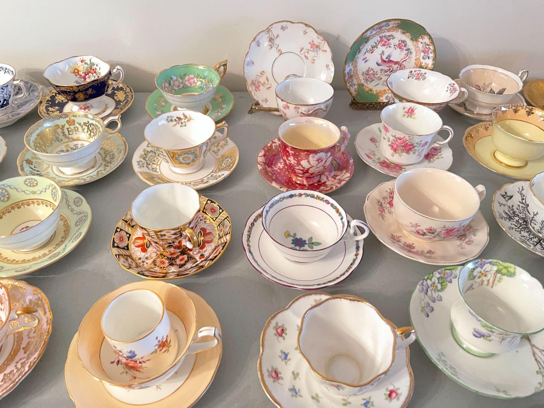 46 teacups and saucers including Royal Paragon, Aynsley, Bluebird, Royal Albert, Lettor China, Royal Crown Derby, Foley China, Sutherland, Royal Chelsea Stanley, Paragon, Hammersley & Co, Royal Sstafford, Balisbury, Royal Winton, Elite Works, Mintons, Staffordshire and LeClair Limoges