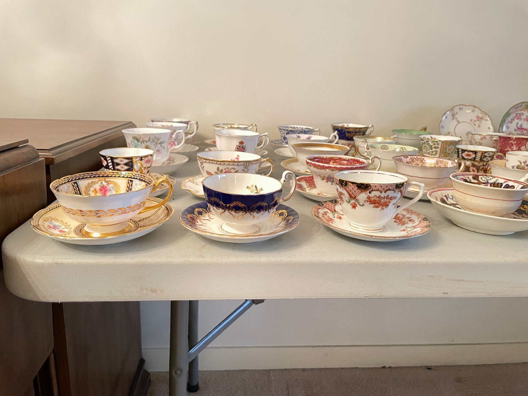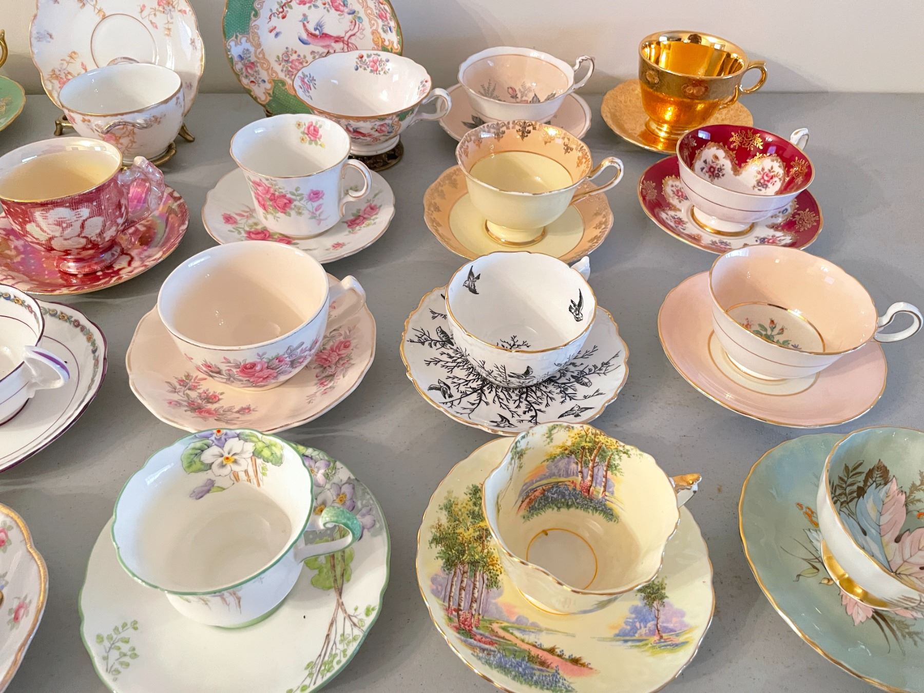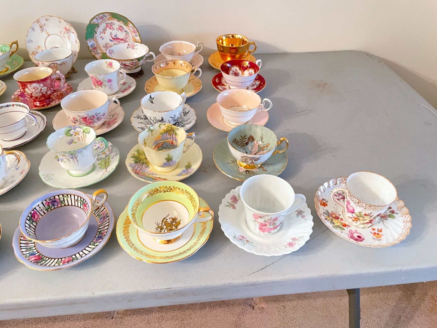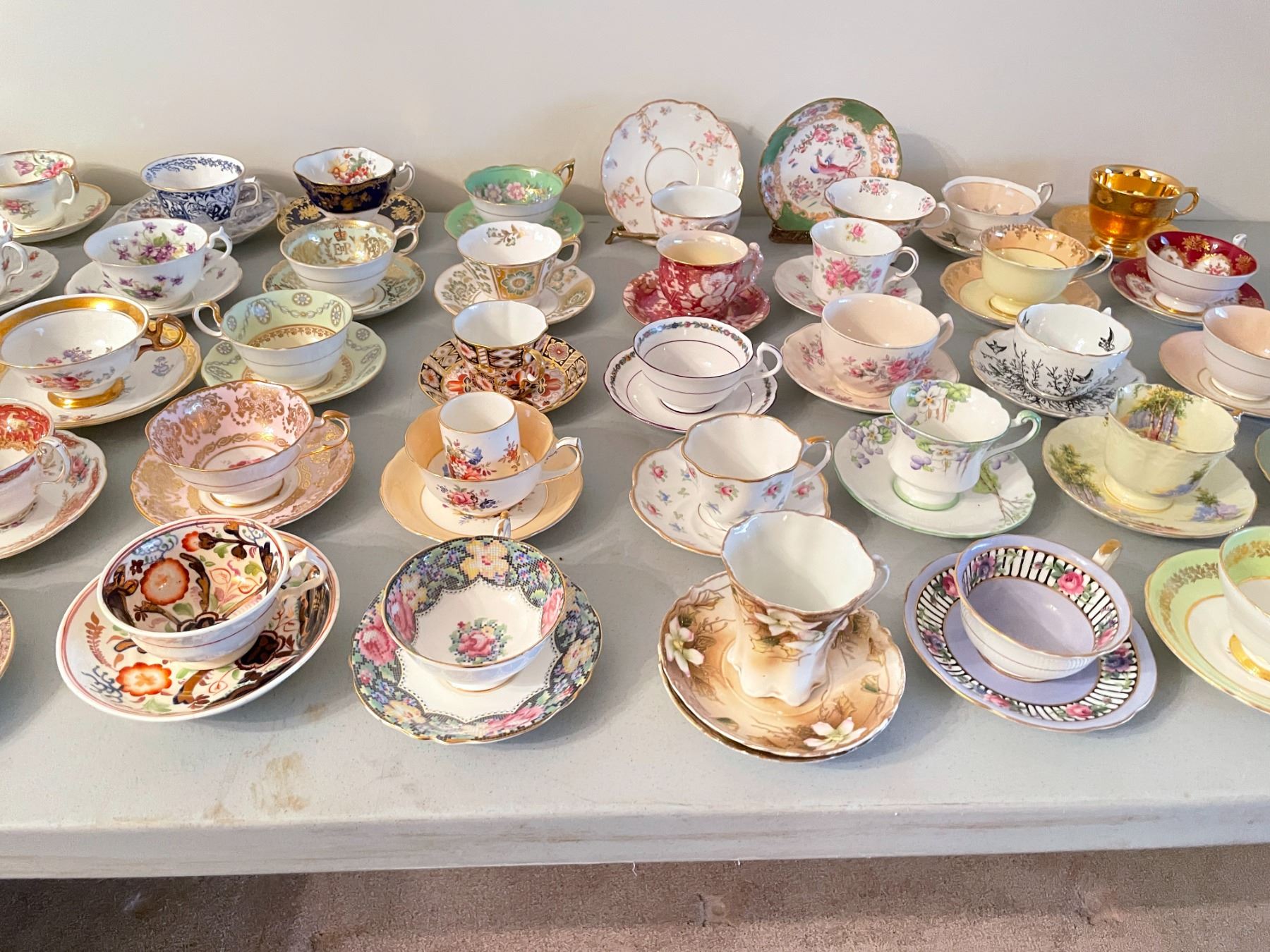 46 teacups and saucers including Royal Paragon, Aynsley, Bluebird, Royal Albert, Lettor China, Royal Crown Derby, Foley China, Sutherland, Royal Chelsea Stanley, Paragon, Hammersley & Co, Royal Sstafford, Balisbury, Royal Winton, Elite Works, Mintons, Staffordshire and LeClair Limoges