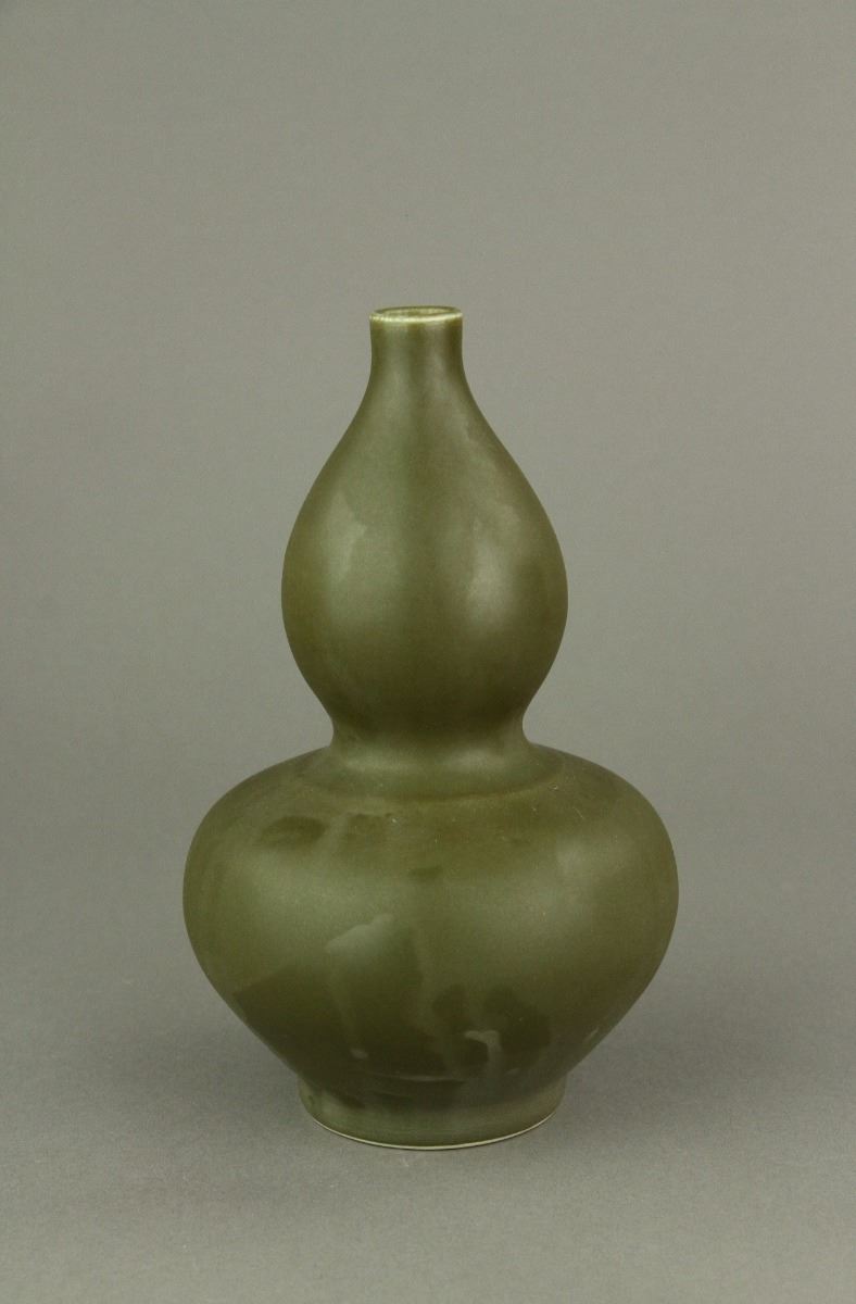 Chinese tea-dust-glazed porcelain vase; of double gourd form; six-character Ming Jiajing mark on base; H: 17 cm, D: 12 cm, 419 grams