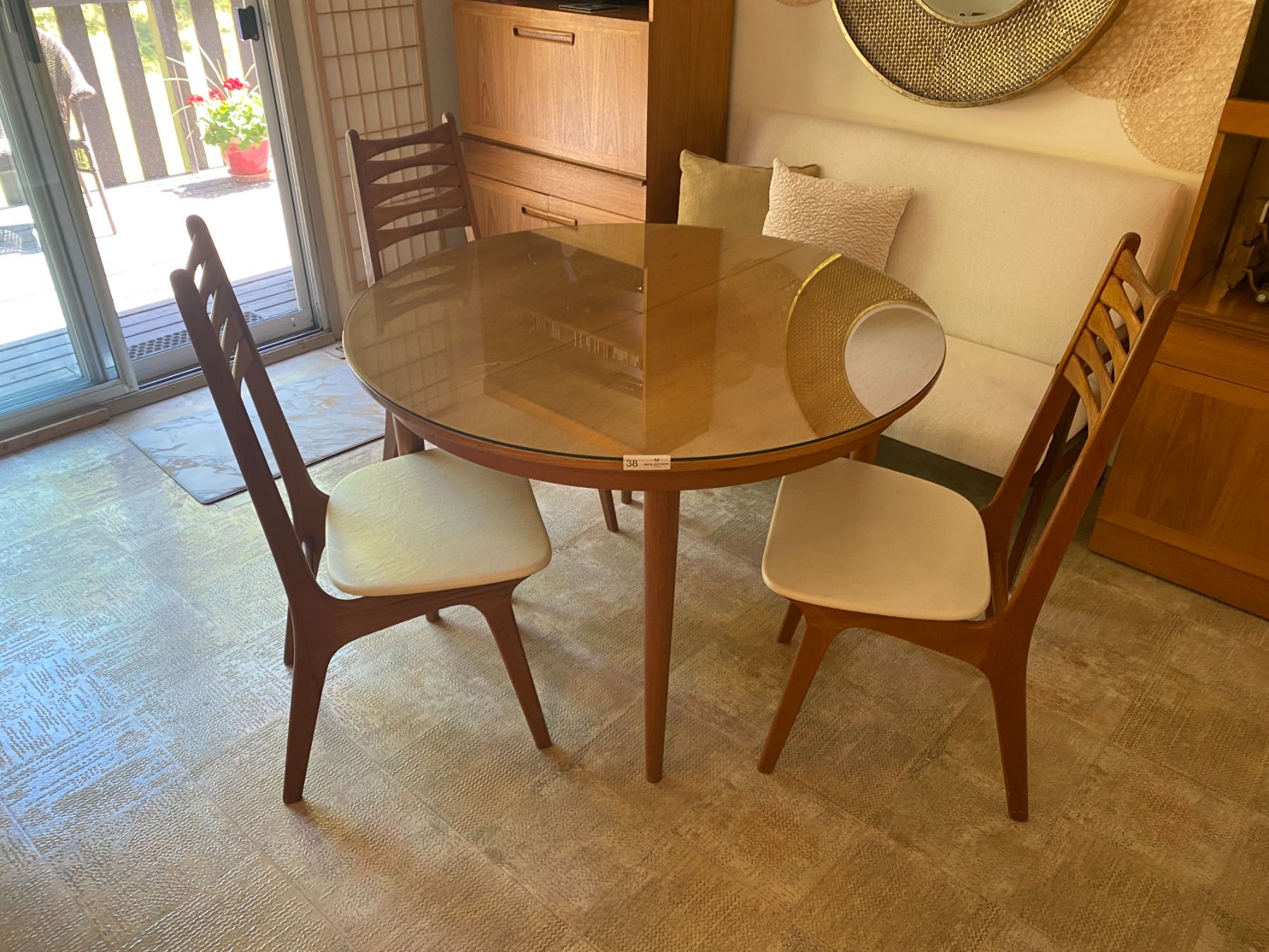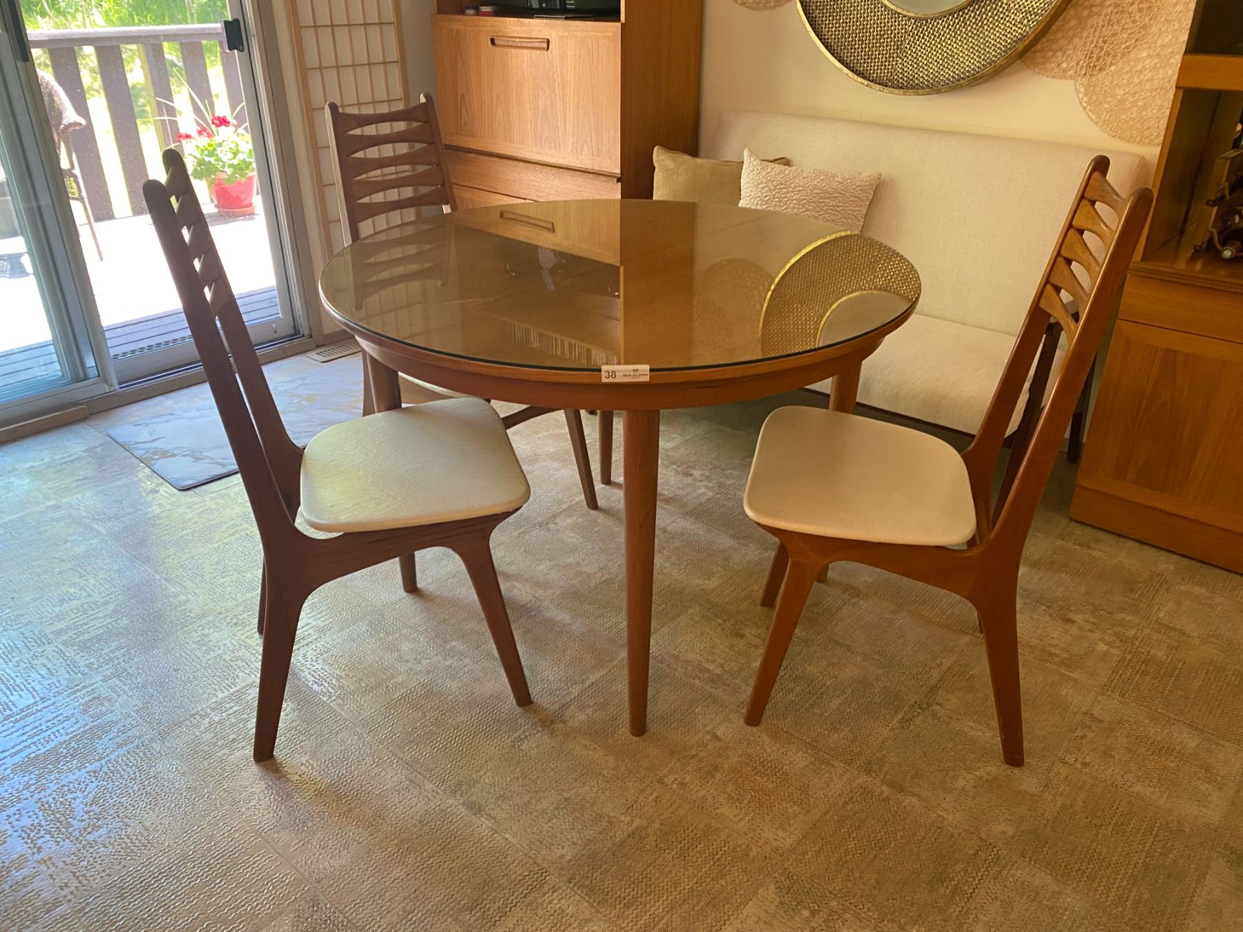 43” Diameter, 29” Tall. Chairs: 18” wide, 38” tall, 17 deep