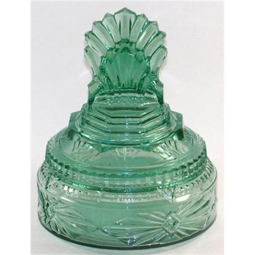 Known as PLEATED FAN, rare in teal blue, and shown on page 51 of Whitmyer - Bedroom & Bathroom Glassware of the Depression Years. The Art Deco high domed lid has a fan like finial with a series of steps at its base. The jar is decorated with sunrays and diamond pattern. Measuring about 5 1/2 inches tall to the top of the fan, and 3 1/2 inches in diameter and is in excellent condition for its age.