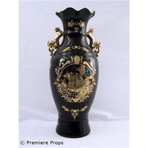 TEAM AMERICA - Freedom hangs by a thread. From the set of the hyesterical spoof, this is a screenused black and gold ceramic vase with gold details and a scene with 4 women, angels and dogs playing with a ball painted on. This vase also features a floral motif, a fluted top and 2 gold dragon handles on each side. There is some chipping at the top of the vase as seen in the picture. This vase measures approximately 23 1/4 x 7 and weighs approximately 12 lbs and will require additional shipping charges. Please contact us before bidding. This key item was used in the foyer of Kim Jong Il's Palace. Add this screenused item to your movie memorabilai collection today! (TA3198)