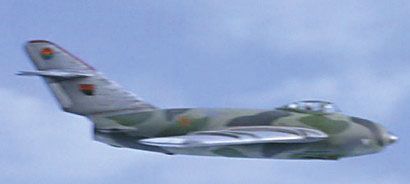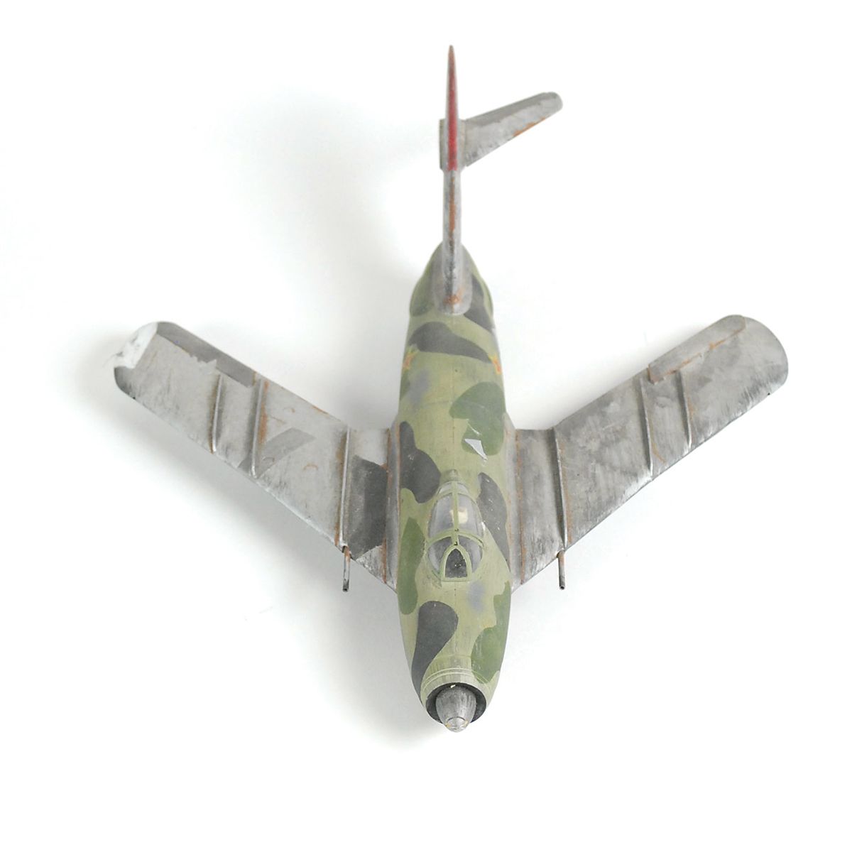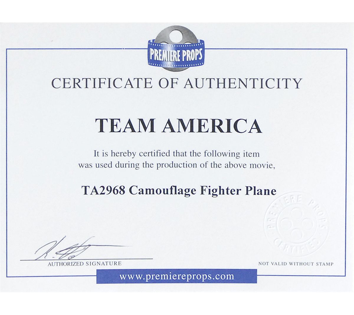 Prop terrorist fighter jet used in the 2004 film Team America: World Police. Lightweight wooden fighter jet is hand-painted in silver and camouflage colors, measures 14? long, and features a turbaned pilot at the controls. In fine condition. Accompanied by a certificate of authenticity from Premiere Props.