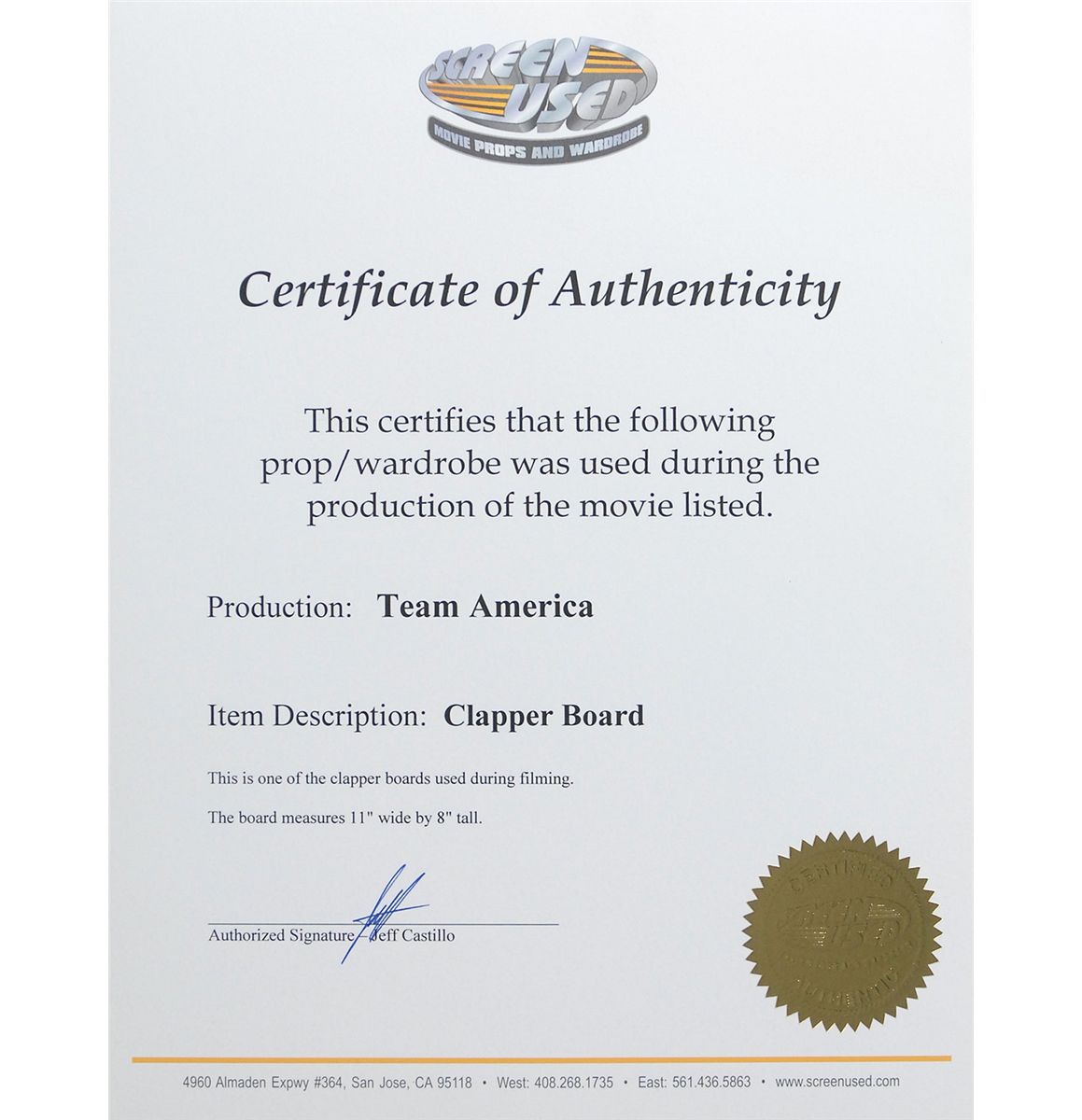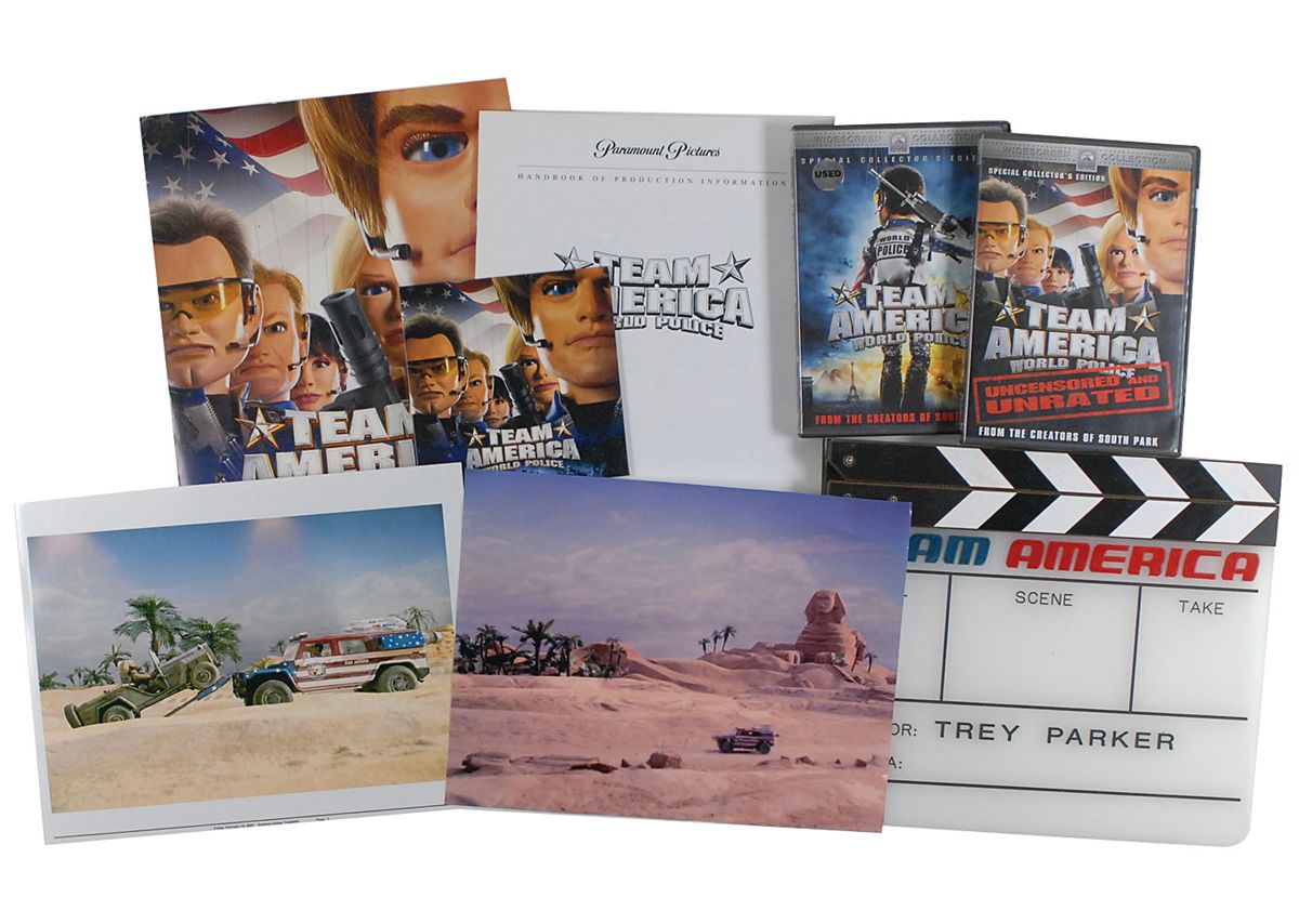 Color 27 x 40 one sheet movie poster for Team America: World Police, signed in black felt tip by Trey Parker and Matt Stone; a Team America clapper board, 11 x 9.5, with Parker’s name impressed onto the director’s line; and a press kit for the film. In fine condition, with some scattered edge dings and creases to the rolled poster.