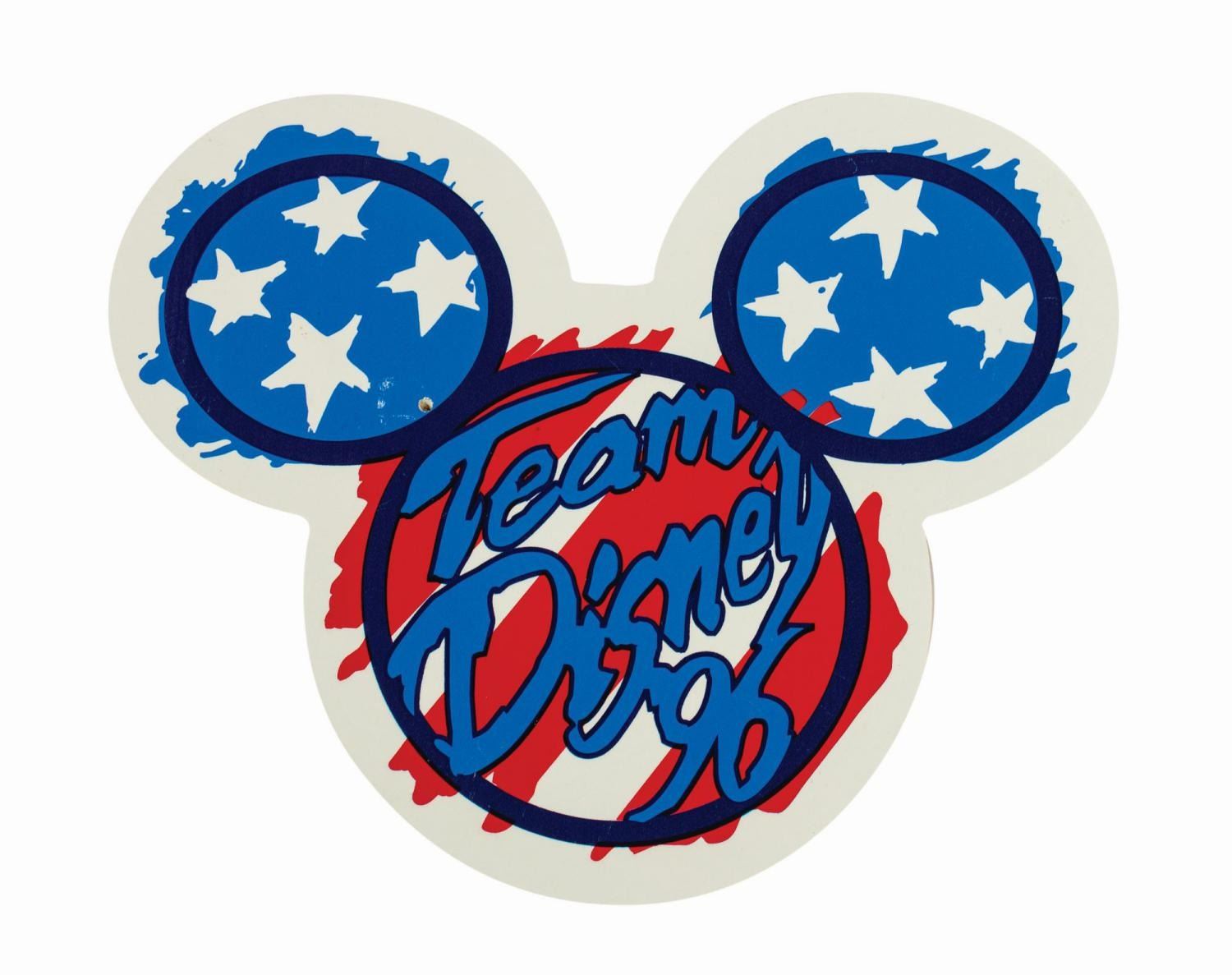 (Walt Disney World, 1996) A sign created to celebrate the 1996 Olympics in Atlanta, GA. The die-cut PVC sign is in a Mickey head shape, with stars and stripes patterning and the words, "Team Disney '96," which is a nod to both Team U.S.A. and the team of cast members working for Disney. Measuring 8"x10", the sign is in very good condition with some minor scuffing to the surface from use. There is a single mounting hole in the left ear, and a hanger on the back which has detached.