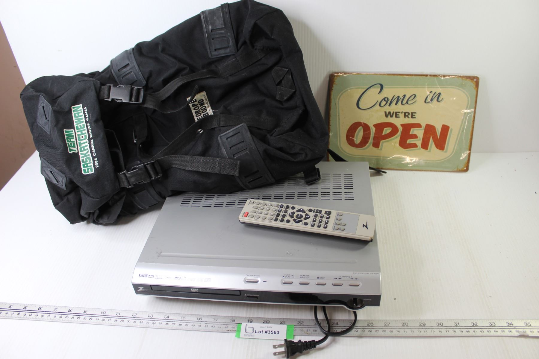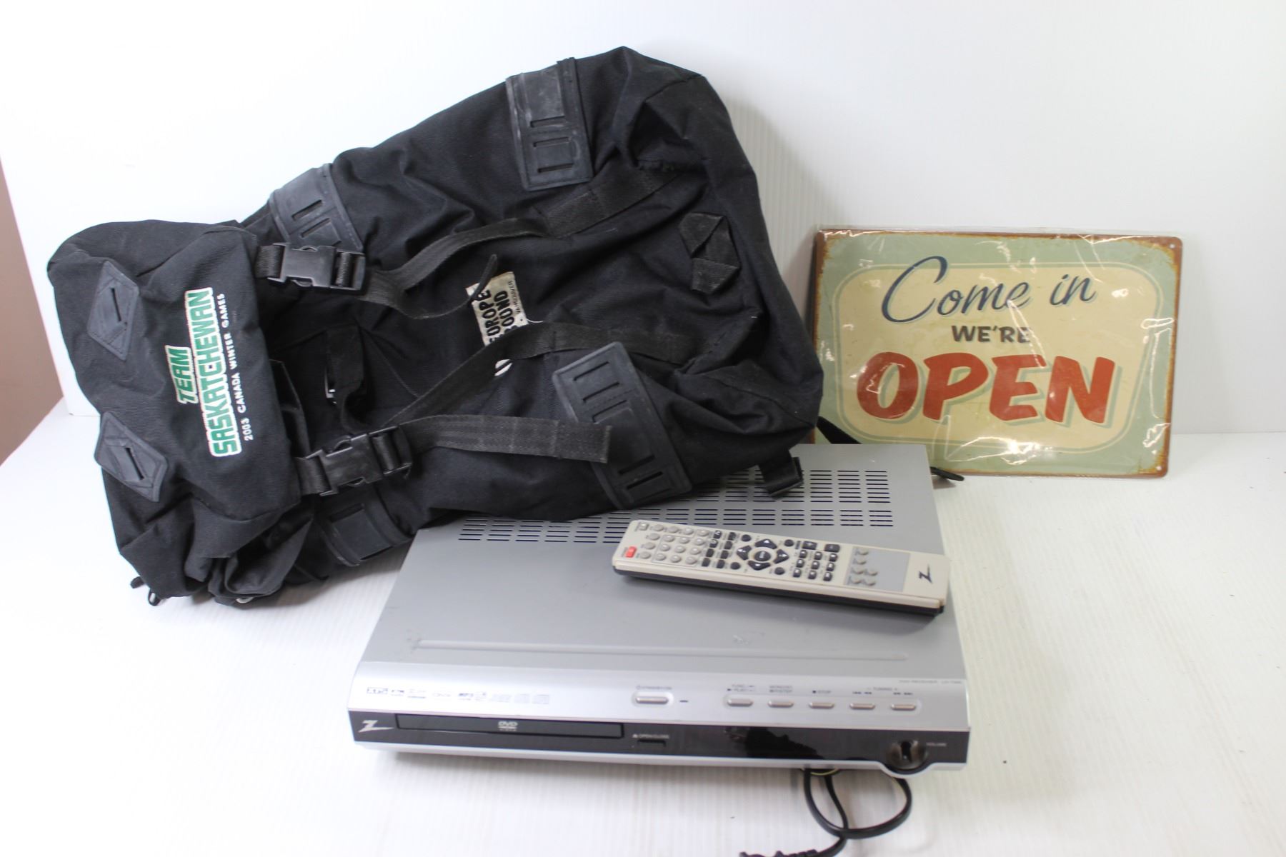 Team Saskatchewan Backpack - Tin Open Sign - Zenith DVD Player w/Remote (powers on)