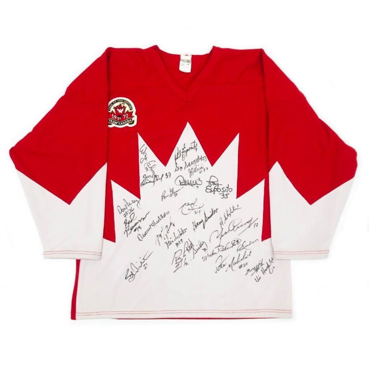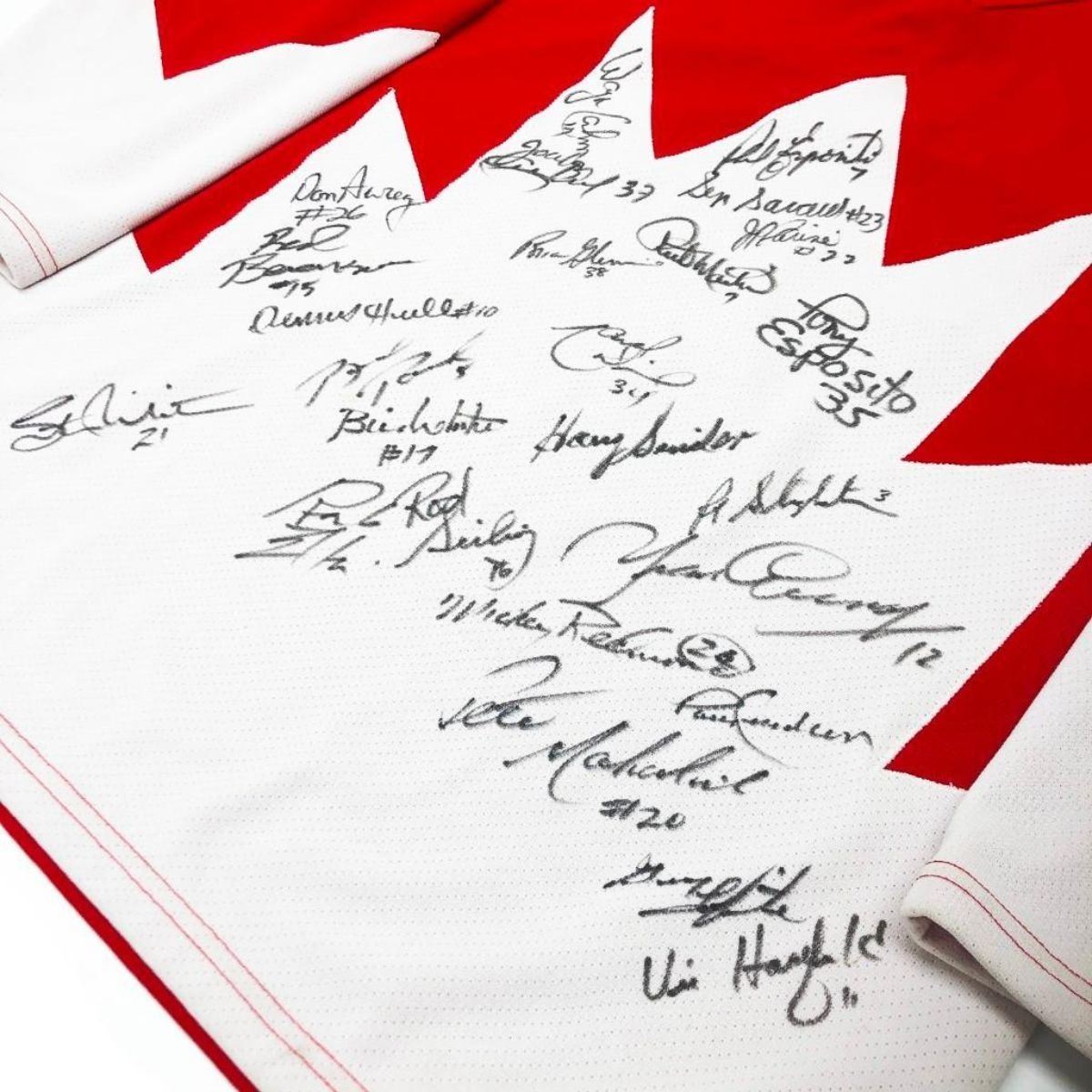 This jersey marks one of the greatest triumphs in Canadian Hockey history. In 1972 Canada faced Russia in a intense all-out 8 game series known as the Summit Series. The bought lasted until the 8th and final game of the series where legend Paul Henderson scored the game winning goal to make Canada the summit champions. Sports memorabilia collectors from across Canada seek signed items by the power house team, and bid vigorously against one another to gain even a small fragment of the historic game. Here we have an item which collects all those fragments onto one canvas, please view the photos for more detailsÂ