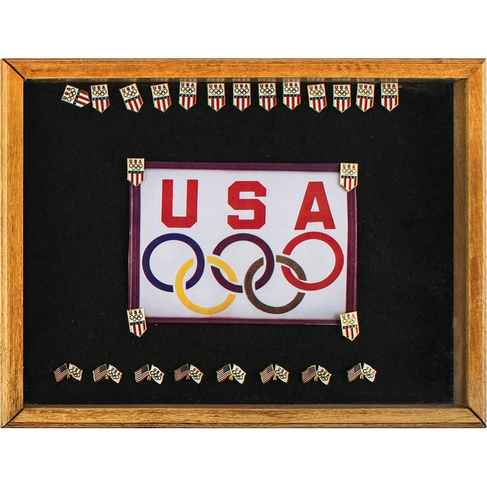 Collection of 25 Team USA Olympic pins, which includes 17 shield pins with “USA†and Olympic rings over four stars and red-and-white stripes, and eight American flag and Team USA Olympic flag pins. All are mounted and framed with a printout Olympic flag to an overall size of 17 x 13.25. In overall fine condition.