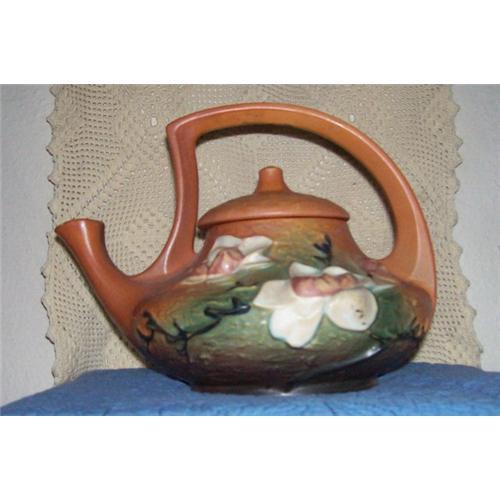 Very nice Roseville Magnolia Teapot. There are no chips, cracks, or repairs on this piece. There is one glazing flaw and one air pop. These happened in production and are not wear flaws. A really beautiful piece.
