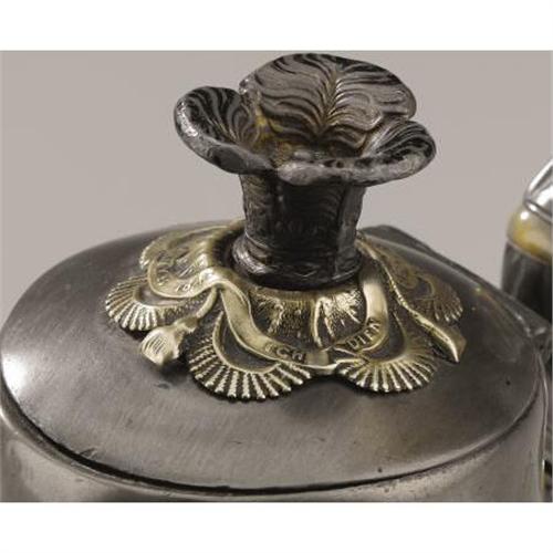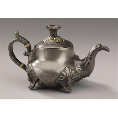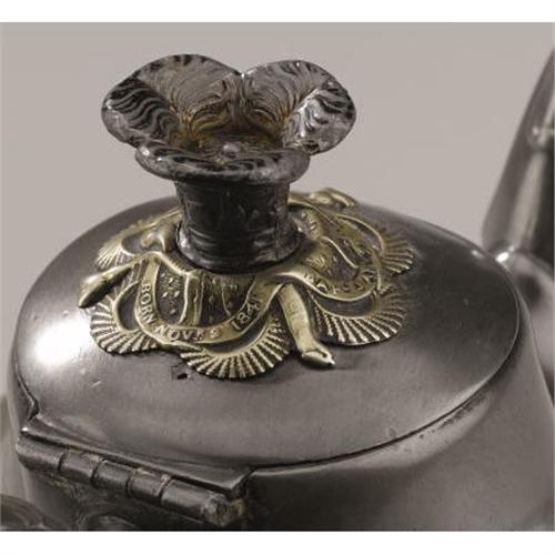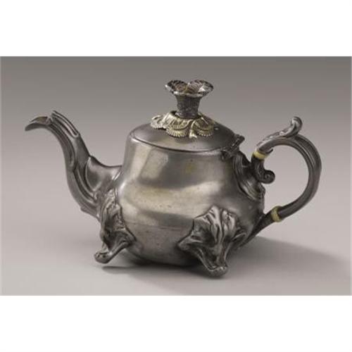 <B>British Pewter Teapot Commemorating the Baptism of Edward VII</B></I><BR><I>1841</B></I><BR><BR>Of bulbous form, on foliate capped legs, the slightly domed cover applied with a floral finial below which is engraved on scrolling ribbons <I>Born November 9th 1841-Bapd January 25th 1841</B></I>, with a curved spout and foliate-capped scroll handle -4 ½ in high<BR><BR>Provenance:<BR>Purchased from Forsyth's, Nashville, TN