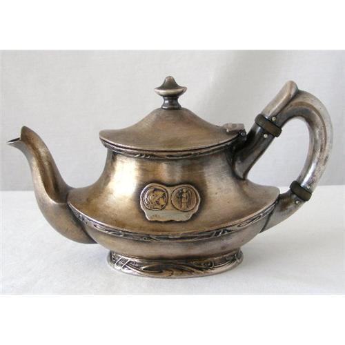 More Pics available. Teapot. Heavy Pewter. Made by Reed and Barton and signed under the base as follows. ?Pat. March 20 1906,Pat March 12 1907, Reed & Barton, Silver Soldered 066-H, 1 P (for 1 pint) Alexandria.? 7.1/2? from spout to handle and 4.3/4? tall. The weight is 1lb 2oz. There are heat spacers on the handle. On one side of the body is a plaque depicting a helmeted mans? head and a standing figure holding a lamp. Hotel ware?