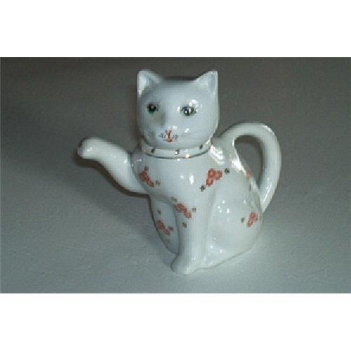 This is really a beautiful, vintage, calico cat teapot. Beautifull handpainted and decorative. Her tail serves as the handle; her paw serves as the pour spout. Her head is removeable to add the liquid. She holds 6 3/4 ounces of liquid. She stands 5 1/2 inches tall with the base measuring 3 1/2 inches long and 2 1/2 inches wide. The bottom of this lovely teapot is stamped in red: Made In China along with other emblems stamped in red. She is dated between 1950 through 1970. Belonged to one of my Aunts' collections.