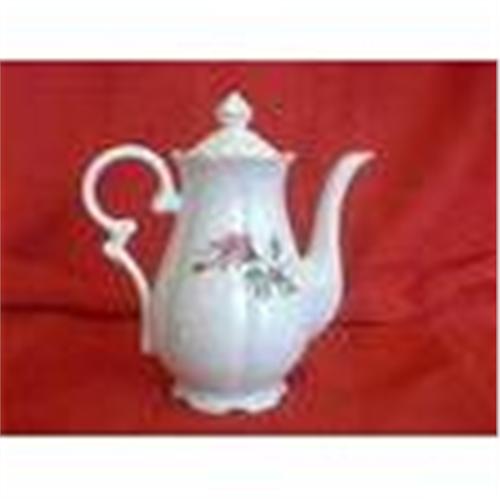 White Teapot with pink roses and trimmed in gold. The teapot is marked "Made in Japan" and measures 7.5 inches high and 7 inches wide from handle to spout. This teapot is in good condition but does have a small sliver that has been clued back on.