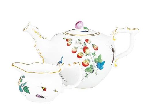Porcelain, colour painting and gilt. Meissen forms with wicker-work rim (ozier), J shape rococo handles, teapot with acanthus leaf and stylised animal form spout and rose bud final. Fruit and insect decoration. Restored. Marked: Herend, circa 1870, Fischer Sámuel period. Teapot: 9 cm, cream jug: 4.5 cm